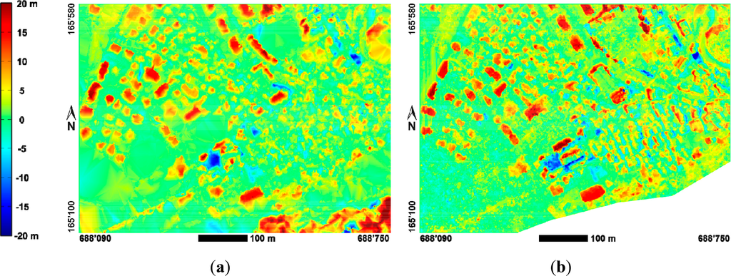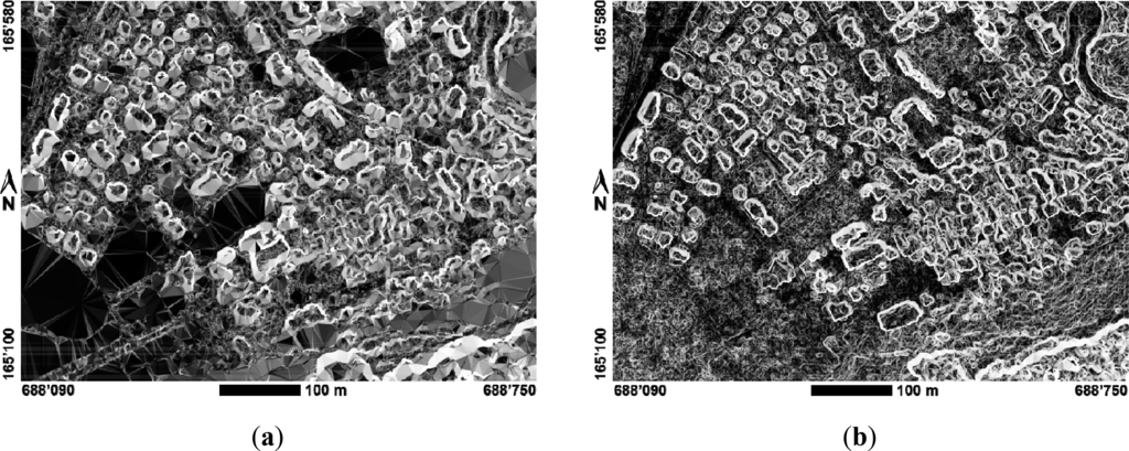 Figure 7 shows the gradients of the extracted DSMs for 2007. It illustrates the much sharper definition of the building edges within the densely matched DSM (SURE) shown in Figure 7b on the right in comparison to the sparsely matched DSM (eATE) in Figure 7a on the left. Finally, the examples of temporal DSM differences for sparsely and densely matched DSMs in Figure 8 demonstrate the additional potential of using densely matched DSMs for rapid visual and analytical landscape change analyses which were not further investigated within our study.