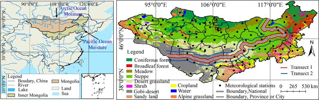 Considering the differences in social and economic activities along the China–Mongolia political border, two transects parallel to the border in a southwest-to-northeast direction were designed to compare vegetation-cover changes on each side of the international border (Figure 1). Transect 1 was approximately 16 km away from the border, and transect 2 was approximately 96 km away from the border.
