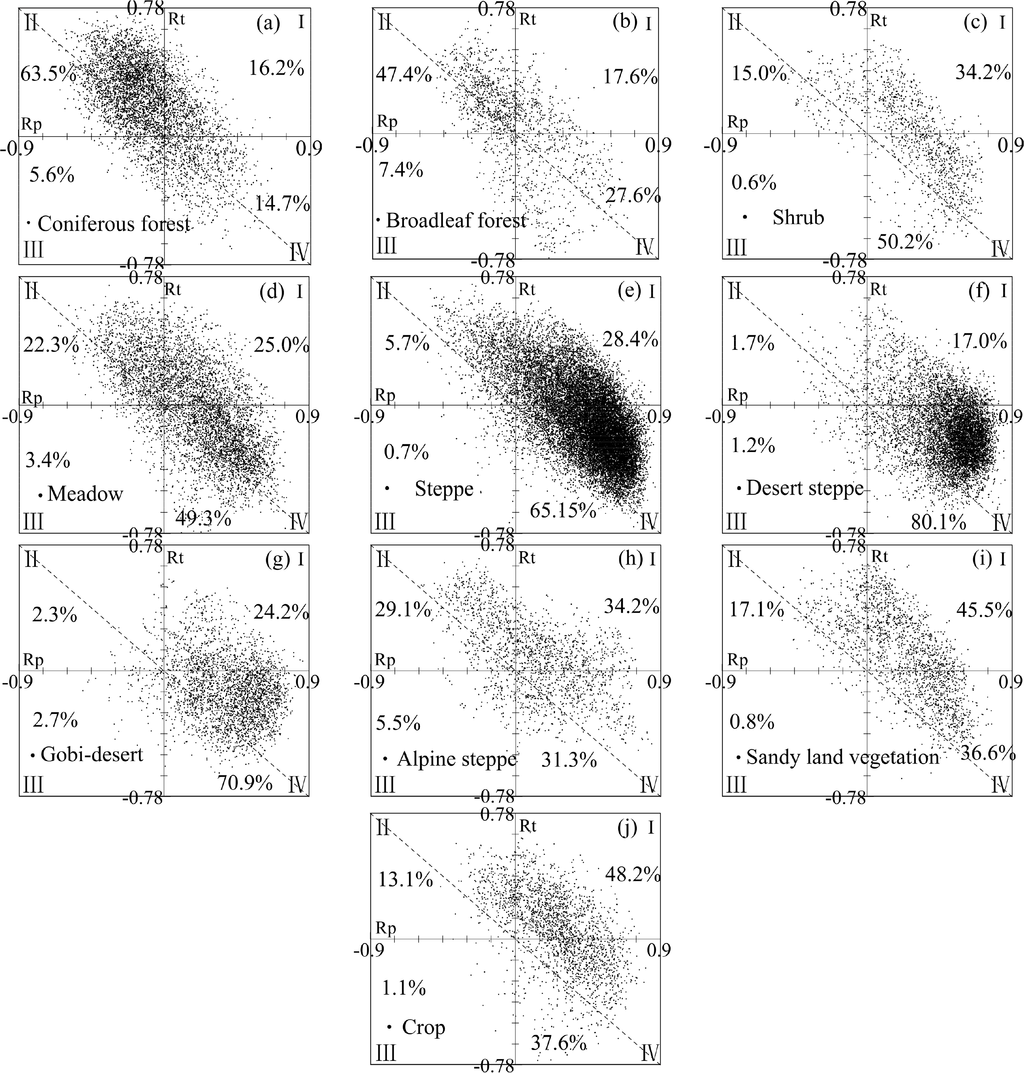 To detect the differences in vegetation response to climate change by vegetation type, correlation coefficients were calculated between the NDVI and the two climatic variables for each pixel and for each vegetation and grassland type (Figure 10). As shown in Figure 10, the relative contribution of climatic variables to vegetation dynamics differed by vegetation and grassland type. For coniferous (Figure 10a) and broadleaf forest (Figure 10b), approximately 79.7% and 65.0%, respectively, of the total pixels of the forest NDVI were positively correlated with temperature and, correspondingly, 69.1% and 54.8% were negatively correlated with precipitation, indicating that temperature may be the key factor regulating forest vegetation growth in the plateau. This may be the case because in the plateau, forest is mostly distributed in areas with cold and humid climates (Figures 1 and 2b), where heat resources are very limited and an increase in temperature could boost forest growth by lengthening the growing period and enhancing photosynthesis [28,45]. Excess precipitation, in contrast, could restrict forest growth. This observation is consistent with the results of Fang et al., who suggested that forest growth tended to decline with increasing precipitation under relatively cold conditions [46] because of the accompanying reductions in temperature [35] and cloud-related solar radiation [28]. Most pixels that correlated positively with temperature are located in the top half of the second quadrant, indicating that the positive effect of temperature is stronger than the negative effect of precipitation in the plateau. Compared to forest, there was an opposite trend in correlations between NDVI and climatic variables for shrub, meadow, steppe, desert steppe, and Gobi Desert vegetation (Figure 10c–g). Approximately 84.4%, 74.3%, 93.6%, 97.1%, and 95.1%, respectively, of the total NDVI pixels for these five vegetation types were positively correlated with precipitation, and, correspondingly, approximately 50.8%, 52.7%, 65.9%, 81.3%, and 73.6% were negatively correlated with temperature. These five vegetation types in the plateau are distributed mostly over areas with a temperate arid and semiarid climate, where rainfall supply is the key factor in vegetation dynamics, an observation, which agrees with previous findings [46,47]. In particular, the proportion of pixels that were positively correlated with precipitation increased from meadow to steppe and then to desert steppe, implying that vegetation water demand strongly increased as aridity increased. The larger magnitudes of negative correlation with temperature suggest that heat conditions are sufficient for growth of these vegetation types in the plateau and that increased temperature may accelerate water evaporation and thus impede vegetation growth [34,48]. However, the proportion of pixels that were positively correlated with temperature was largest for meadow, implying that a temperature increase could also enhance meadow steppe growth. This may be attributed to the locations of meadows. The meadowlands in the study area are mostly distributed in the transitional zone from forest to steppe, where the positive effect of temperature on vegetation growth was also more evident. The largest number of pixels that were correlated positively with precipitation, for these five vegetation types, are located in the top half of the fourth quadrant, indicating that the positive effect of precipitation is stronger than the negative effect of temperature in the plateau. For sandy land vegetation and crops (Figure 10i,j), although the positive effect of precipitation was also predominant (82.1% and 85.8% for sandy land vegetation and crops, respectively), the temperature effect on vegetation growth was more complex. This may be partly attributed to human activities as discussed above. For alpine steppe (Figure 10h), the scatter-plot was almost equally distributed in the first, second, and fourth quadrants, suggesting more complex effects of temperature and precipitation on vegetation growth for alpine steppe in the plateau.