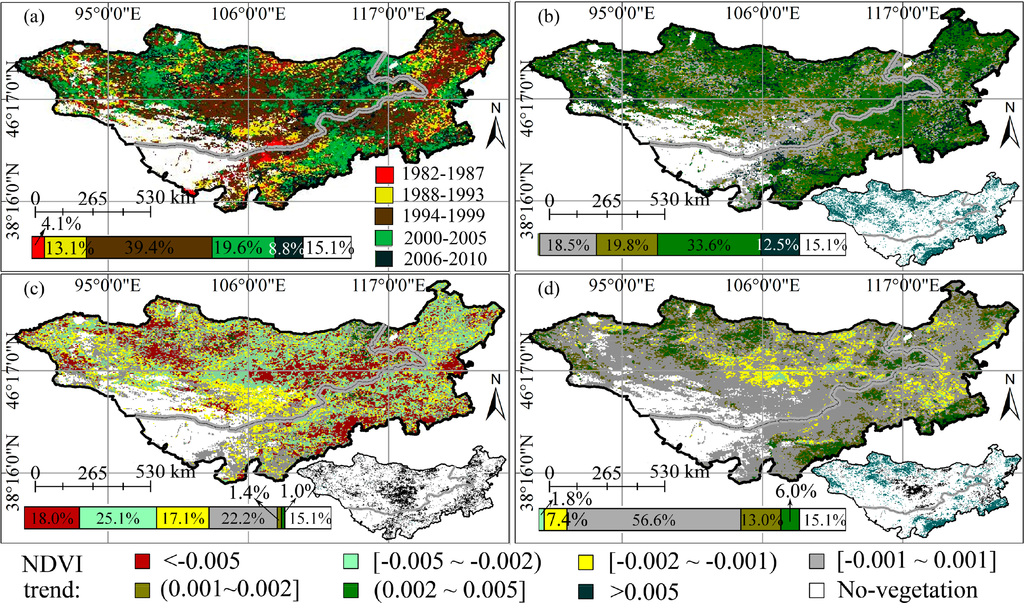 According to the year with the peak NDVI value, the NDVI trend RY was identified for each pixel (Figure 11a). The NDVI trend in approximately 39.4% of the study area reversed between 1994 and 1999, especially in Central and Western Mongolia and Central and Eastern Inner Mongolia. Approximately 19.6% of pixels experienced their NDVI reversal between 2000 and 2005, with these concentrated in the eastern and northwestern parts of Mongolia and the two sandy land regions (Hunshan Dake sand and Horqin sand) of Inner Mongolia. A relatively small number of pixels experienced the NDVI reversal during the periods 1982–1987, 1988–1993, and 2006–2010, accounting for 4.1%, 13.1%, and 8.8% of the plateau, respectively.