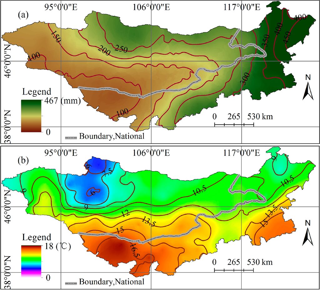 Climatic datasets consisting of monthly mean temperatures and monthly precipitation amounts were collected from 108 meteorological stations (Inner Mongolia: 48, Mongolia: 60) across the plateau (Figure 1) and provided by the Inner Mongolia Weather Bureau and the Mongolia Weather Bureau. According to the locations of meteorological stations, monthly climatic data were first interpolated in the ArcGIS environment using the Kriging method at a spatial resolution of 8 km, and rasterized time sequences of growing-season mean climatic variables were then generated to match both temporally and spatially the time sequences of growing-season mean NDVI. The spatial patterns of annual mean temperature and precipitation in the study area are shown in Figure 2.