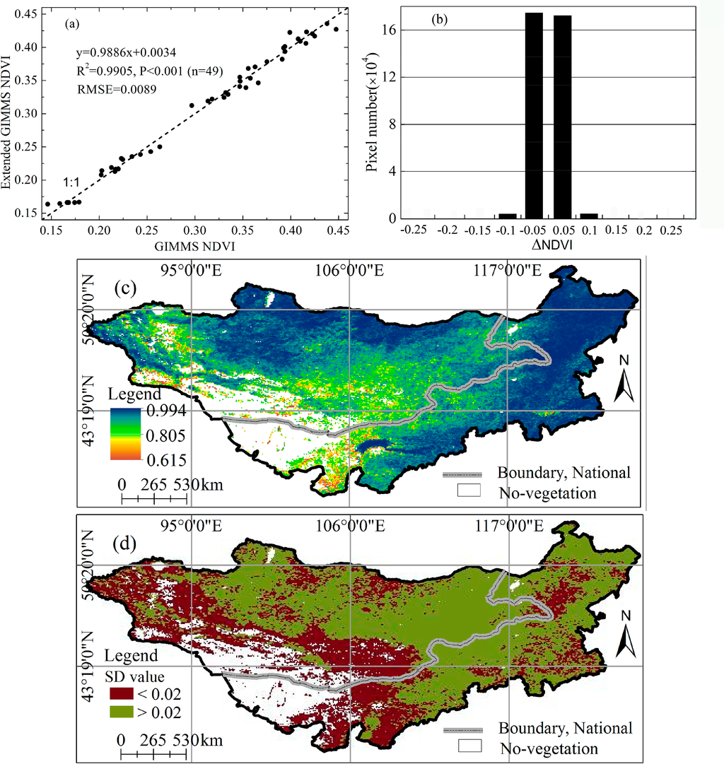 The calibration results from the per-pixel linear regression model demonstrated that the continuity and consistency of the newly constructed NDVI (Extended GIMMS NDVI) is in strong agreement with the traditional GIMMS NDVI, with a coefficient of determination of 0.99 and an RMSE value of 0.0089, implying the feasibility of the per-pixel linear regression model to calibrate NDVI data from one sensor to another. High per-pixel correlations also exist between the two monthly NDVI datasets, which can detect the spatial patterns of vegetation dynamics in the plateau.