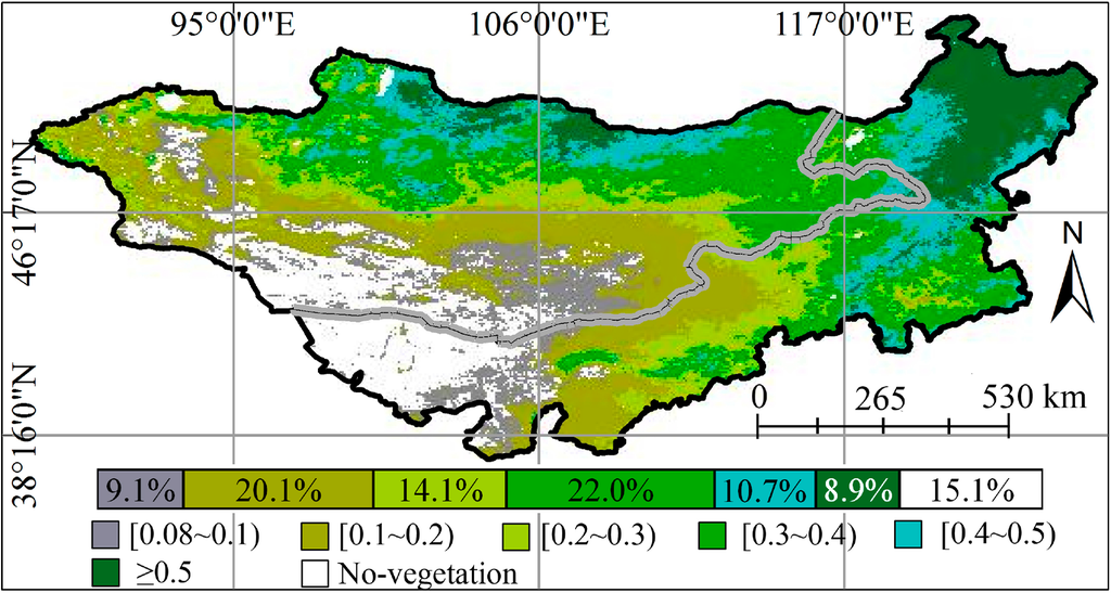 In addition to the climatic impact on vegetation changes, the impacts of human activities were also more obvious in some parts of the plateau. For example, significant NDVI increases in southern Inner Mongolia (i.e., the transition zone between agriculture and rangelands in Inner Mongolia) (Figure 11d) could be attributed to Chinese environmental protection and land rehabilitation projects in these areas [44] because the NDVI increased significantly although no significant correlations were observed between the NDVI and the two climatic variables. These observations can also be confirmed by other studies, which have revealed that vegetation cover has improved in Southern Inner Mongolia since the implementation of Chinese vegetation restoration programs such as grazing rotation, seasonal enclosures, and the Grain for Green program [38,51].