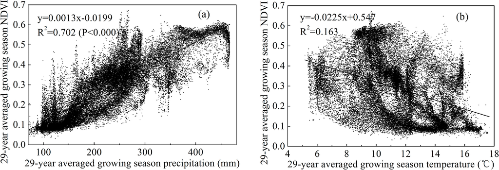 Figure 5 highlights the spatial patterns of the 29-year mean NDVI in the plateau. Consistent with the distribution of vegetation types (Figure 1), the NDVI exhibited a decreasing trend from the northeast to the southwest and from the north to the south. The pixels with an NDVI value >0.5 accounted for 8.9% of the plateau and tended to be distributed over northern Mongolia and Northeastern Inner Mongolia, in areas of high-density forest. Moderately high values between 0.2 and 0.5 are observed in the central parts of the plateau, where the land is dominated by meadow and steppe grassland, accounting for 46.8% of the plateau. Low NDVI values < 0.2 were generally distributed in the dry grasslands of the southwestern and western regions, accounting for 29.2% of the plateau. It is noteworthy that this spatial pattern also appeared to be spatially coupled with the precipitation pattern (Figure 2a), indicating that precipitation is the primary climatic control on vegetation activity in the plateau, although the relatively complex contribution of climatic variables to vegetation growth may be regionally dependent. This result is strongly supported by the significant positive correlation between the NDVI and the precipitation for each pixel (Figure 6a). However, the NDVI was negatively, but non-significantly, related to temperature at the plateau scale (Figure 6b), suggesting that against the background of global warming, the growing-season thermal resources in the plateau are sufficient and that an increase in temperature may restrict vegetation growth because of temperature-related drought [3].
