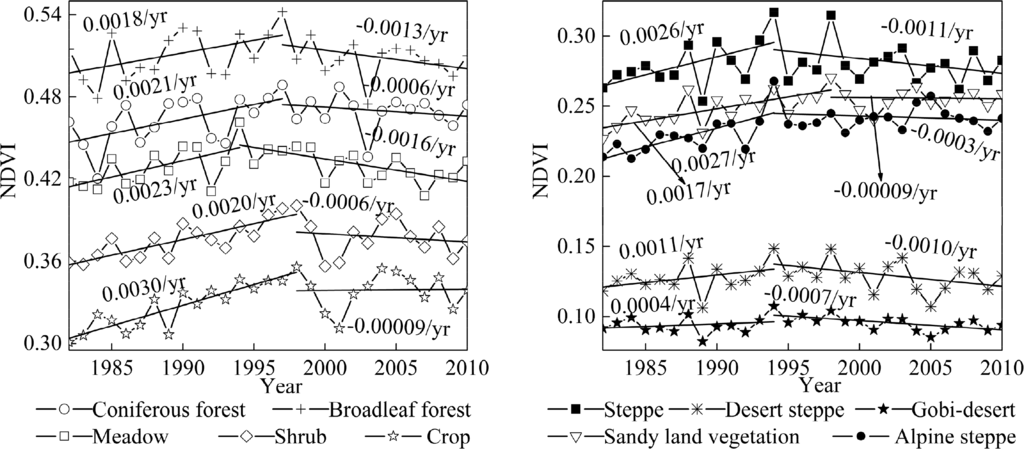 Due to different growth environments, the vegetation dynamics for different vegetation [3] and grassland types [34] responded differently to climate change. In the entire study period, the increasing trends in NDVI for all biomes reversed, with the RY apparently differing by vegetation type (Figure 9). For coniferous and broadleaf forest, the NDVI significantly increased by 0.0021/yr (R = 0.56, p = 0.02) and 0.0018/yr (R = 0.49, p = 0.05), respectively, before 1997. After 1997 coniferous and broadleaf forests, correspondingly, decreased by −0.0006/yr (R = −0.21, p = 0.48) and −0.0013/yr (R = −0.38, p = 0.19). Although the NDVI trend reversals for shrubland, sandy land vegetation, and cropland all occurred in 1998, the NDVI trends of the two latter vegetation types, which are mostly distributed in Inner Mongolia, remained highly stable, and no obvious decreasing trend was observed from 1998. This may be attributed to Chinese ecological conservation projects [44] and improved agricultural practices (irrigation, fertilizer use) [35] that may have effectively relieved or even offset drought/climate-induced vegetation decline for the regions where cropland and sandy land are distributed and may have prevented further desertification [44]. In comparison, the NDVI trend reversal for three widely distributed vegetation types: grasslands in the plateau as meadows, steppe and desert steppe, and sparse vegetation in the Gobi Desert arrived three or four years earlier than in other biomes, in 1994, with respective rates of increase of 0.0023/yr (R = 0.61, p = 0.03), 0.0026/yr (R = 0.59, p = 0.03), 0.0011/yr (R = 0.40, p = 0.17), and 0.0004/yr (R = 0.22, p = 0.46) before 1994 and corresponding rates of decrease of −0.0016/yr (R = −0.64, p = 0.005), −0.0011/yr (R = −0.35, p = 0.17), −0.0010/yr (R = −0.45, p = 0.07), and −0.0007/yr (R = −0.61, p = 0.009) afterwards. In particular, the significant decrease in desert steppe since its RY suggests that desertification is currently a serious environmental issue in the areas where desert steppe is distributed. Frequently occurring sandstorms in the last decade may also have originated from this area. It seems that the reversal (1994) of steppe grasslands dominated the reversal of the whole Mongolian Plateau because these constitute the largest area in the plateau. The alpine steppe increased significantly until 1994 with a yearly increment of 0.0027/yr (R = 0.72, p = 0.005) and then stalled afterward with little variation.