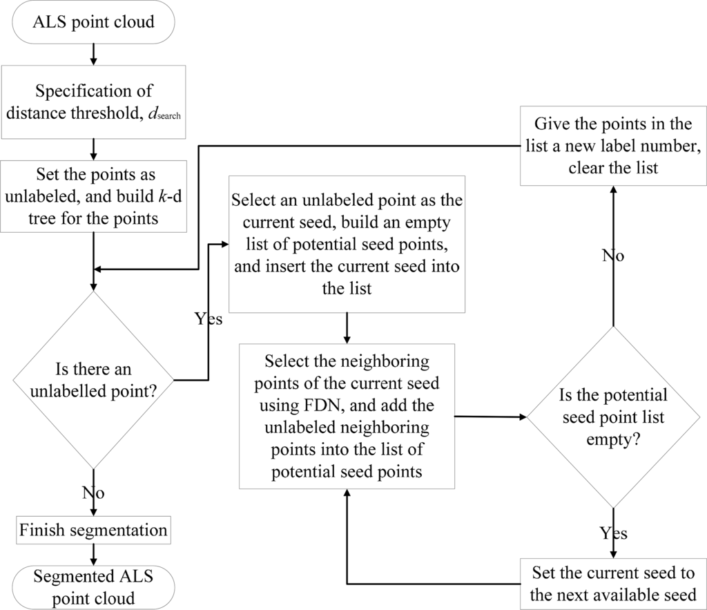 The classic PTD has two main steps. The first step is selecting seed points and constructing the initial TIN. The second step is an iterative densification of the TIN. The improved method embeds the SUSC between these two steps mentioned above. Specifically, after selecting the lowest points in each grid cell as initial ground seed points, SUSC is employed to expand the set of ground seed points to as many as possible, as this can identify more ground seed points for the subsequent densification of the TIN-based terrain model [22].