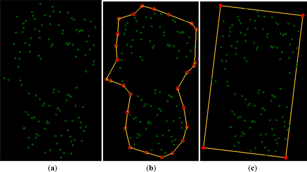 Boundary: The boundary that closely encompasses the point cluster could be determined by finding the alpha shape of the points, as shown in Figure 4b.