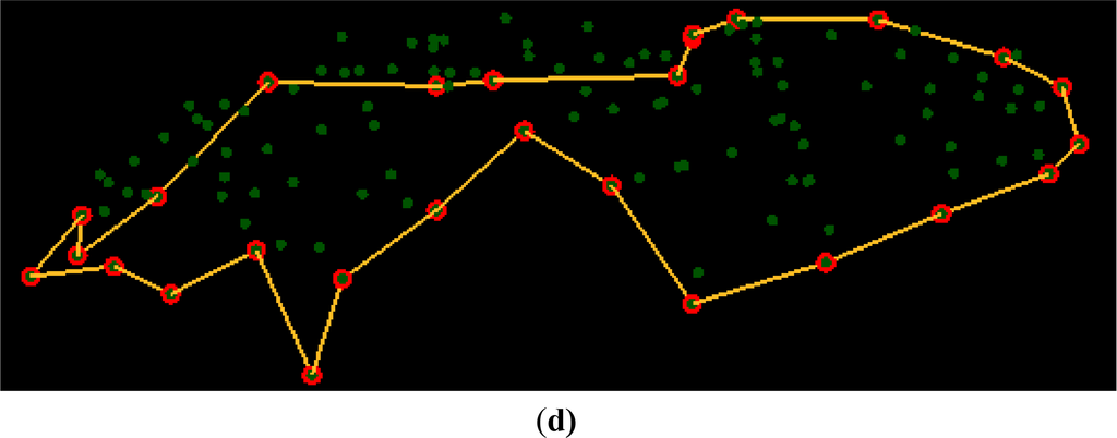 To compare our proposed method with other existing methods, the mean-shift-based vehicle extraction method [16] is also implemented and employed to extract the vehicles from the point cloud with the highest point density. For the implementation of SVM, the software package LIBSVM ( http://www.csie.ntu.edu.tw/~cjlin/libsvm/) by Chang and Lin [26] is adopted; for the implementation of k-d tree, the software package ANN ( http://www.cs.umd.edu/~mount/ANN/) by [27] is adopted; and for the implementation of mean shift, the method in [16,28] is realized. The mean-shift-based segmentation result refers to Figure 7a, and most of the points belonging to one vehicle are segmented into one segment. In the sampling step, two classes of segments, including the vehicle segments and the non-vehicle segments, are selected by a human operator. Note that the sampling progress should be repeated many times based on the SVM-based classification results until there are not many obvious classification errors. In the classification, the features for area, elongatedness, planarity, vertical position and range are employed [16]. As a matter of fact, for the first SVM-based classification, the detected vehicles are quite similar to the ones displayed in Figure 3a based on the initial training samples. Thus, we increase the samples of non-vehicles and the final training samples; see Figure 7b. The final classification result is shown in Figure 7c, and the extracted vehicles refer to Figure 7d. Visual inspection of the result suggests that most vehicles are extracted, while many vehicles are lost, and many non-vehicle objects are also mistaken as vehicles.