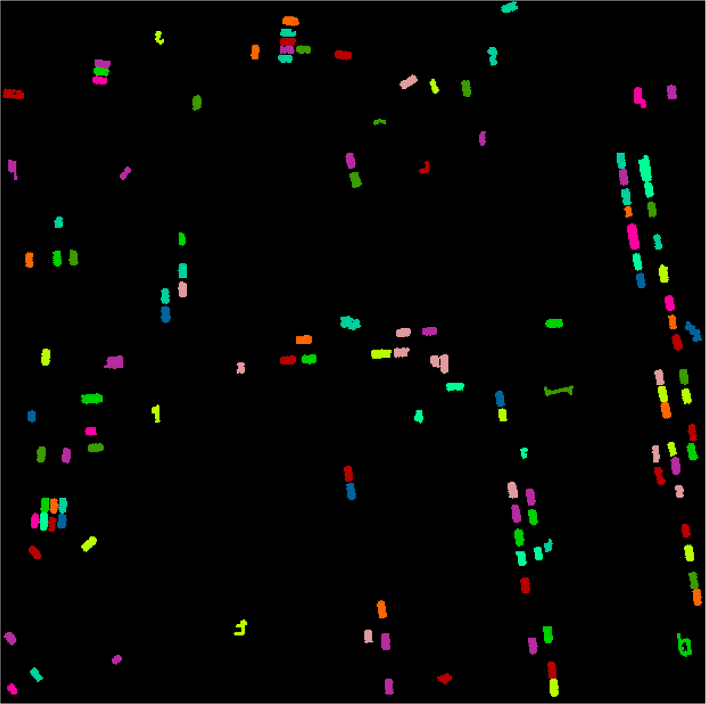The framework of 3D CCA refers to Figure 2. In this method, the key parameter is the 3D distance threshold, dsearch. The vehicle points in the point cloud of Figure 1c are displayed in Figure 3a, and the corresponding result of 3D CCA is displayed in Figure 3b. Figure 3b shows that, after 3D CCA, the vehicle points are clustered, and the points belonging to the same vehicle may be grouped into the same segment. However, oversegmentation or undersegmentation is still a problem for the above point cloud segmentation if dsearch is not good enough or the scene is too complex, which is inevitable in our proposed method.