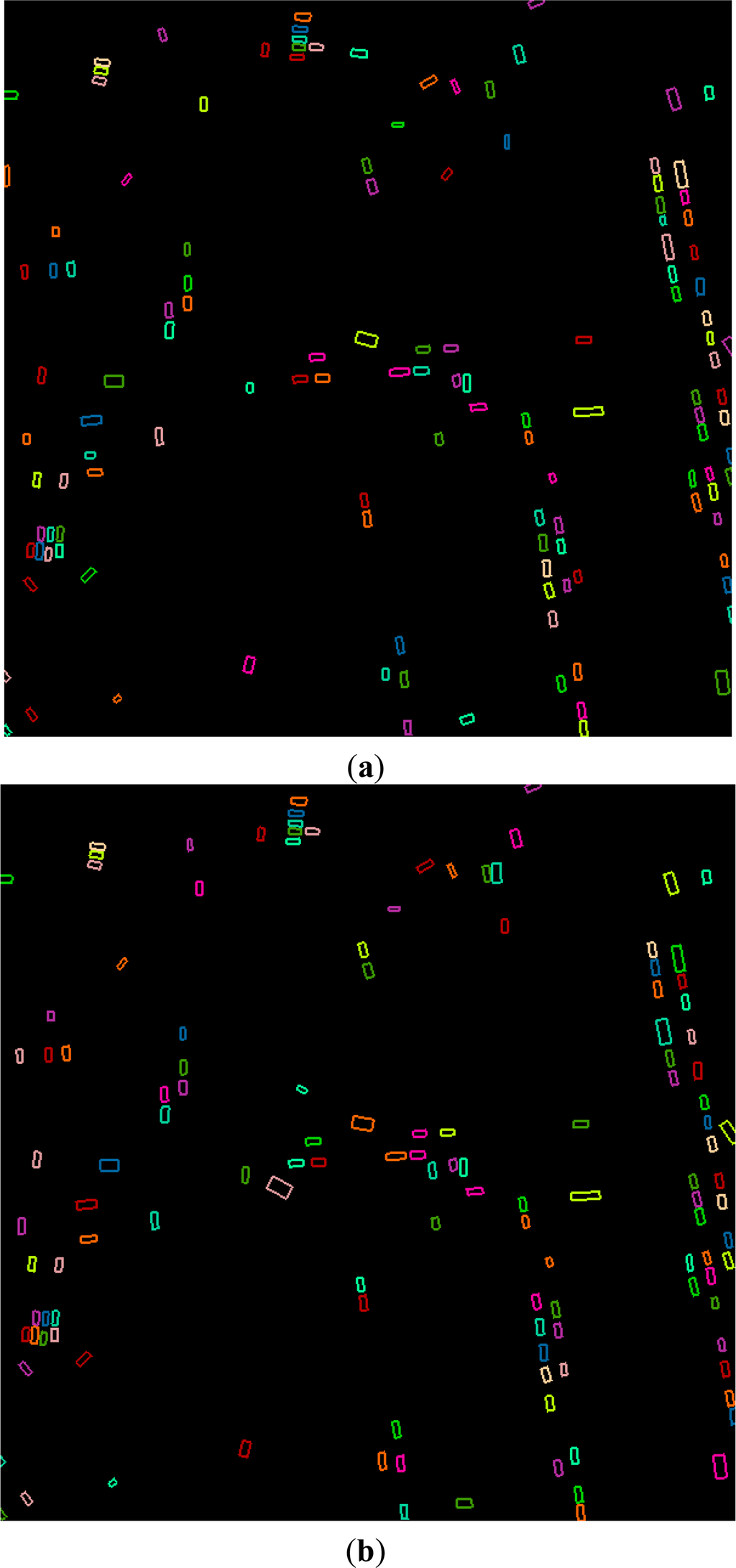 To evaluate the performance of our approach, three measures, including completeness, correctness and quality, are used. Correctness is TP/TP + FP, completeness is TP/TP + FN and quality is TP/TP + FP + FN; where TP is the sum of true positives, FP is the sum of false positives and FN is the sum of false negatives [29]. Moreover, the ground truth data are acquired by manual interpretation of both the original and the filleted point cloud, as shown in Figure 6a. Particularly, there are 136 reference vehicles in the scene.