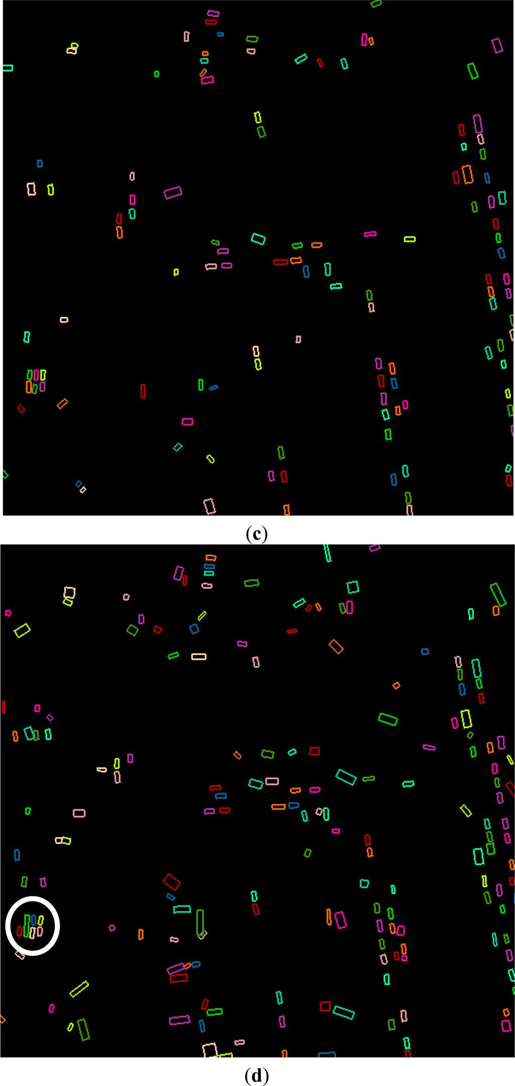 The automatically extracted vehicle from the three datasets by our proposed method is shown in Figure 6b–d. Visual inspection of the results suggest that, when the point density decreases from 40 points/m2 to 10 points/m2, there are more vehicles extracted, but there are more errors. Particularly, there are 129, 131 and 161 vehicles extracted from the dataset with a point density from highest to lowest, respectively. Among them, there are 109, 105 and 103 true vehicles, respectively. Moreover, if the vehicle is very close to low objects or the vehicles are very close to each other, errors may occur, as shown in the ellipse in Figure 6d. Additionally, rectangular objects with the same sizes and heights as the vehicles can be hardly distinguished from vehicles. In short, most of the vehicles are extracted by our proposed method, but there are some errors in the results. Moreover, the proposed method is sensitive to the point density.