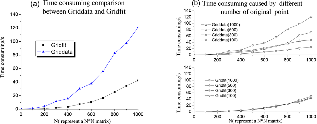 Figure 1 shows a time-consumption comparison between Griddata (−v4) and Gridfit. It can be seen that the time consuming of Griddata increases more rapidly than the Gridfit as the Ns increase (Figure 1a) and that the time consumption using Gridfit is independent of the original point number, while the use of Griddata becomes more time consuming with an increase in the number of original points (Figure 1b).