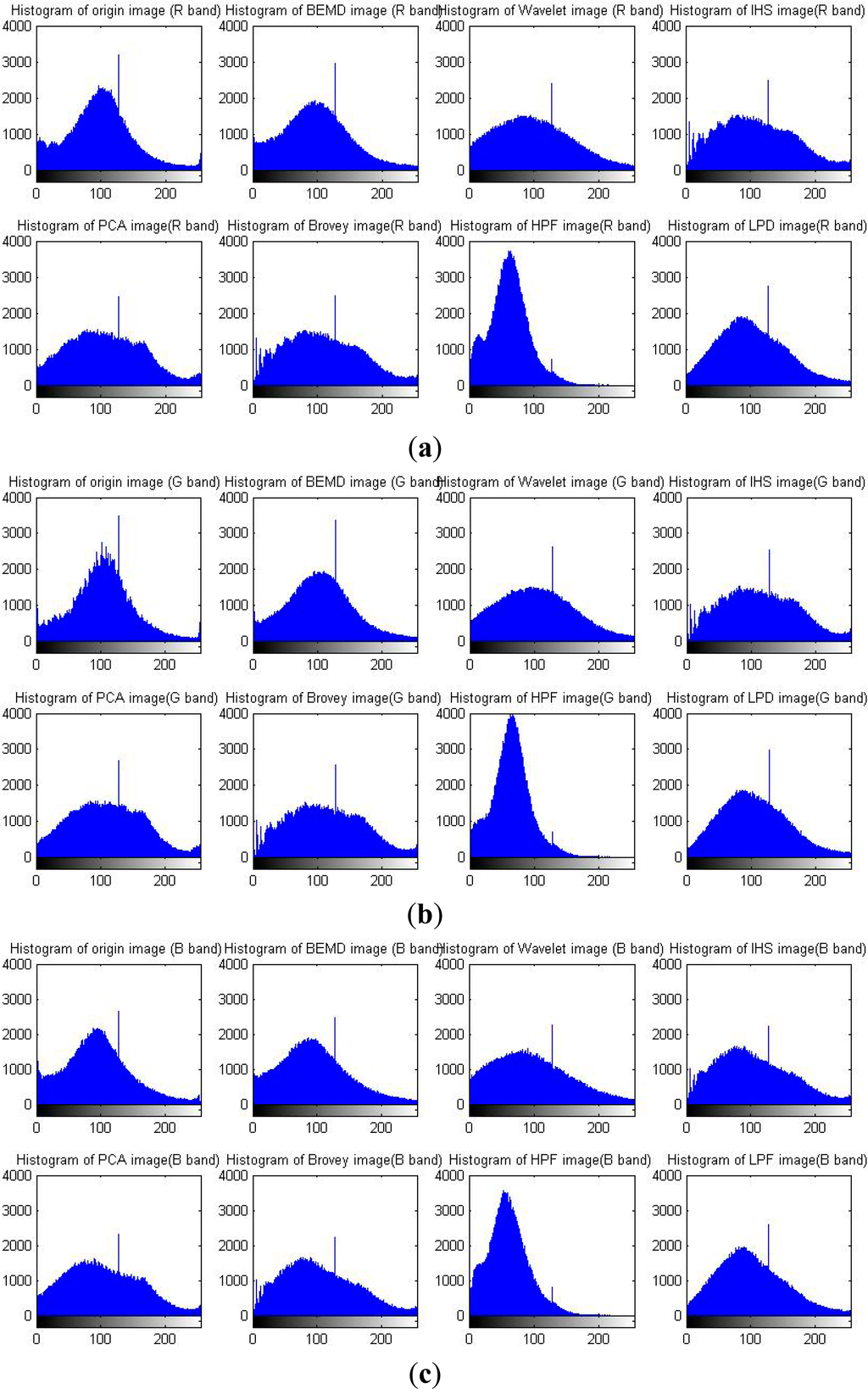 The average gradient reflects the image clarity. The resulting values (Table 1) using BEMD are between those of the panchromatic image and the multispectral image. This result indicates that BEMD enhanced the detail of the multispectral image. The value using IHS is the highest among the methods because of the replacement of the intensity band with the panchromatic image.
