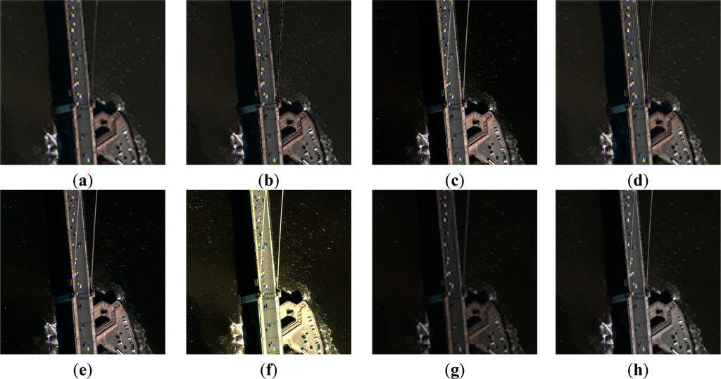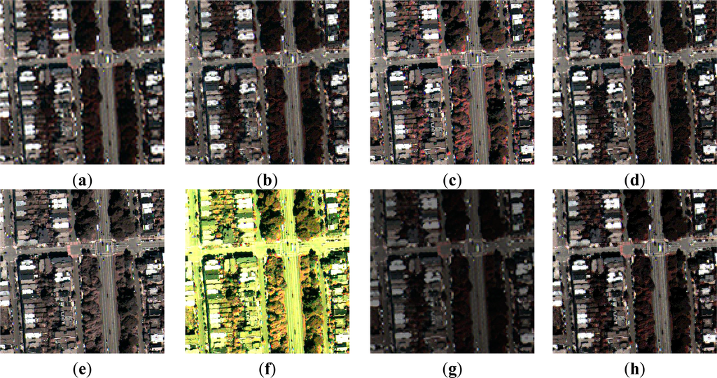 For the first experiment, to compare fusion techniques performance with different land cover types, an image fusion dataset was obtained from [37] (an open data share platform) with five land cover types such as urban, vegetation, seaside, resident and bridge. The dataset was collected by Beijing key laboratory of digital media, whose image source is WorldView-II (0.5-m panchromatic resolution and 2 m multispectral resolution). Figures 11 and 15 shows the fusion result of seven fusion techniques under five land cover types.