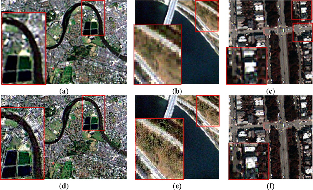 Secondly, not only good spectral preservation ability with different land cover types, but good performance on different type sensors is also validated (See Figure 16). Including the above TM/SPOT (28 m/4 m resolution) and WorldView-II multispectral and panchromatic (0.5 m/2 m resolution) image combination, another IKONOS multispectral and panchromatic (4 m/1 m) image attended to contrast.