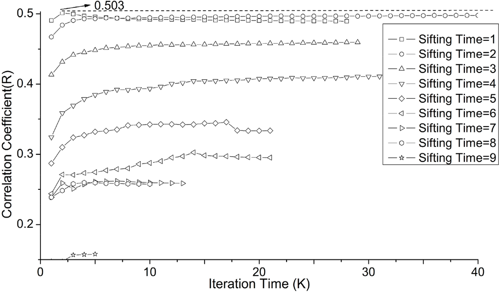Here we choose 2 as the component (both IMF and residual) limit for purposes of optimizing the correlation coefficient between the V band and the residual. We obtain the correlation coefficient using various sifting and iteration times. Because each sifting process will extract an IMF from the residual, the more the sifting time, the smaller the correlation coefficient. As shown in Figure 5, the largest correlation coefficient appears on the second iteration of first sifting time. Thus, one sifting process results an IMF and a residual. One IMF is the extracted highest-frequency component, and the residual is the low-frequency component. This result explains why we choose 2 as the limit. The most related low frequency component still appears at first sifting time while the limitation is set to a value greater than 2. In addition, more sifting time severely reduce the efficiency of the algorithm.