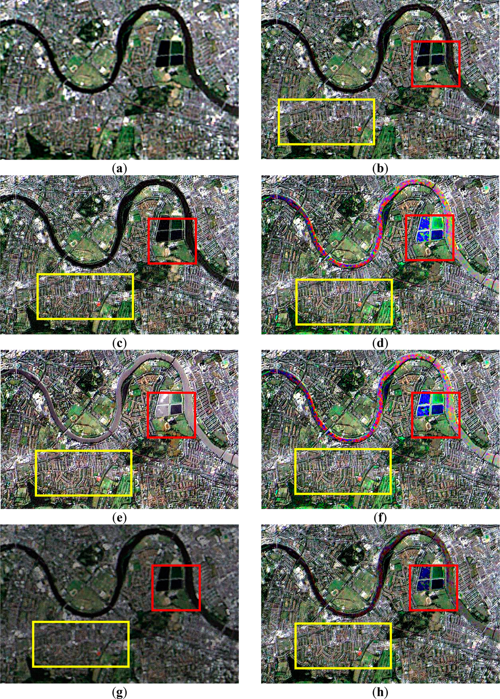 In term of image clarity, it can be shown from yellow boxes in Figure 8 that all methods enhanced the detail information. Compared with the original spectral image, all the methods provide richer detail information in the roads and the outlines of buildings. We cannot easily develop conclusions regarding which method is better in terms of the clarity of the fused images based on the above experiment. A more accurate assessment is conducted in the quantitative analysis in Section 4.2. In the wavelet fused image, there are some blocks and ring effects.