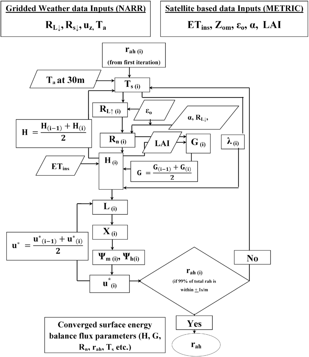 The availability of high-resolution gridded weather and remote sensing-based data has opened up important opportunities to understand and compute fluxes for different surface and atmospheric conditions. In this study, bulk surface resistance (rs) was computed from inverting the fully-populated PM and aerodynamic (AERO) methods for latent heat flux (λE) using instantaneous ET (ETins) obtained from the Mapping Evapotranspiration at High Resolution using Internalized Calibration (METRIC) Landsat-image based surface energy balance. The analyses either use the same latent heat flux (λE) from the METRIC model when Landsat-based Ts is used or modifies the METRIC-generated λE based on iteratively calculated Ts. The impact of using iteratively calculated surface temperature (Ts) was examined to understand its influence on the λE calculation in both the λEPM and λEaero approaches. The results of the comparisons between the λEPM and λEaero methods show that both methods produce identical results when Δ (f = Ts, Ta)) is used in the PM method and other parameters, including net radiation (Rn), soil heat flux (G) and buoyancy, are based on full, physically-based computations. The use of the surface energy balance combined with remote sensing techniques facilitated sensitivity analysis for the computation of these fluxes, including λE. A backward-averaged accelerated numerical solution (BAANS, Dhungel et al. [22]) was used to simulate surface energy balance flux parameters based on gridded weather and satellite-based data for two satellite overpass dates under clear sky conditions, although the analysis can be extended to any atmospheric and surface condition. The description and computation procedure of the surface energy balance flux parameters using BAANS is shown in Figure 1 and detailed in Appendix A. BAANS utilizes instantaneous evapotranspiration (ETins) and other vegetation indices from the METRIC (Allen et al. [23]) model and gridded weather data from North American Regional Reanalysis (NARR) (Mesinger et al. [24]) (Figure 1).