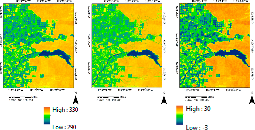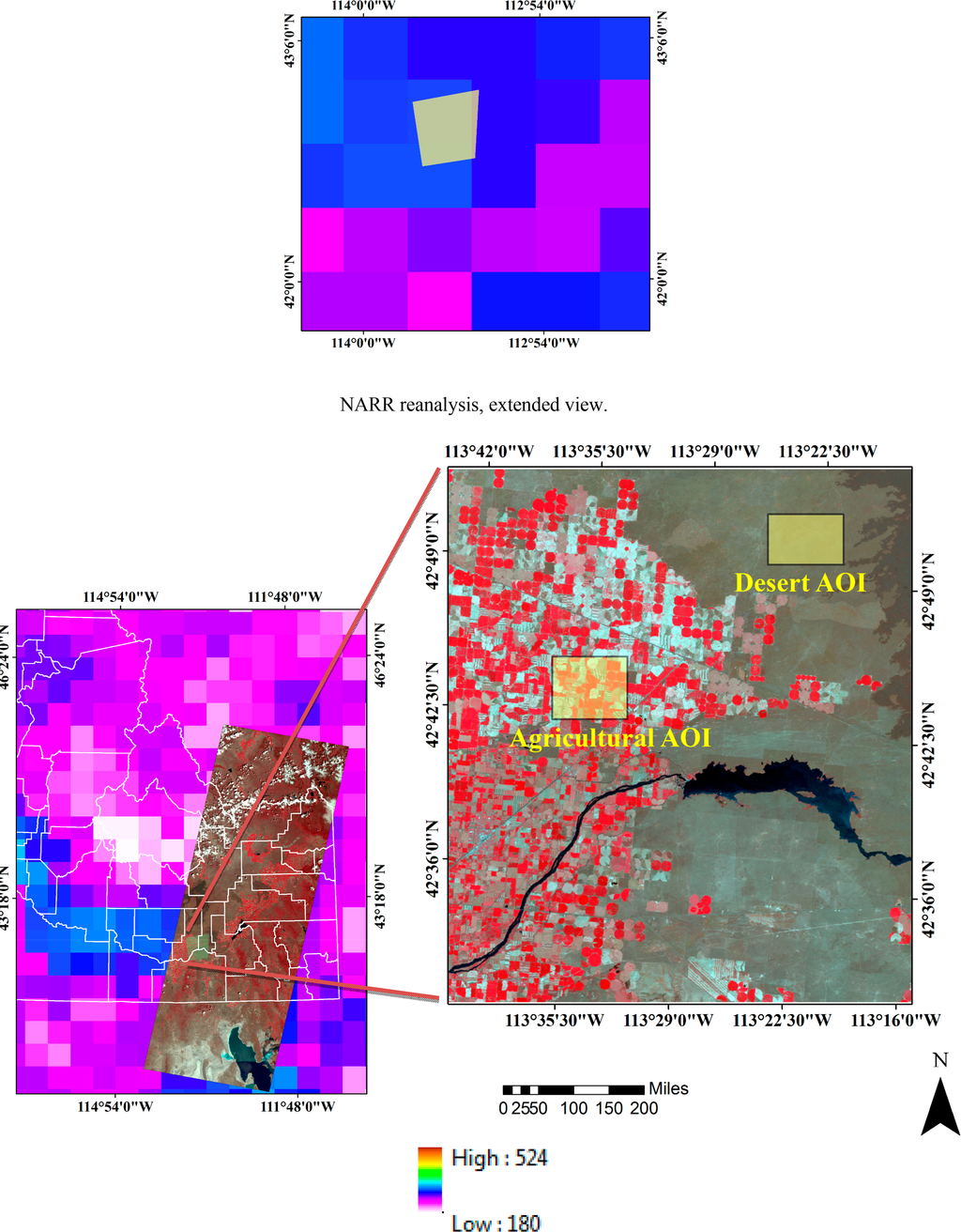 Figure 2 shows the study area using a Landsat image from 18 June 2008, and NARR reanalysis image for the same date. The bottom left side of Figure 2 shows NARR reanalysis incoming longwave data (W/m2) for 18 June 2008, which is overlain by an Idaho county border map. The upper left figure is an expanded view of the NARR reanalysis data used in the study AOI. Incoming longwave radiation from NARR reanalysis varied between 273 and 322 W/m2 in the expanded AOI with about 50 W/m2 difference. Two sub-AOIs, one in agricultural land and another in sagebrush desert, were selected for statistical analysis in the 32-km study area (Figure 2).