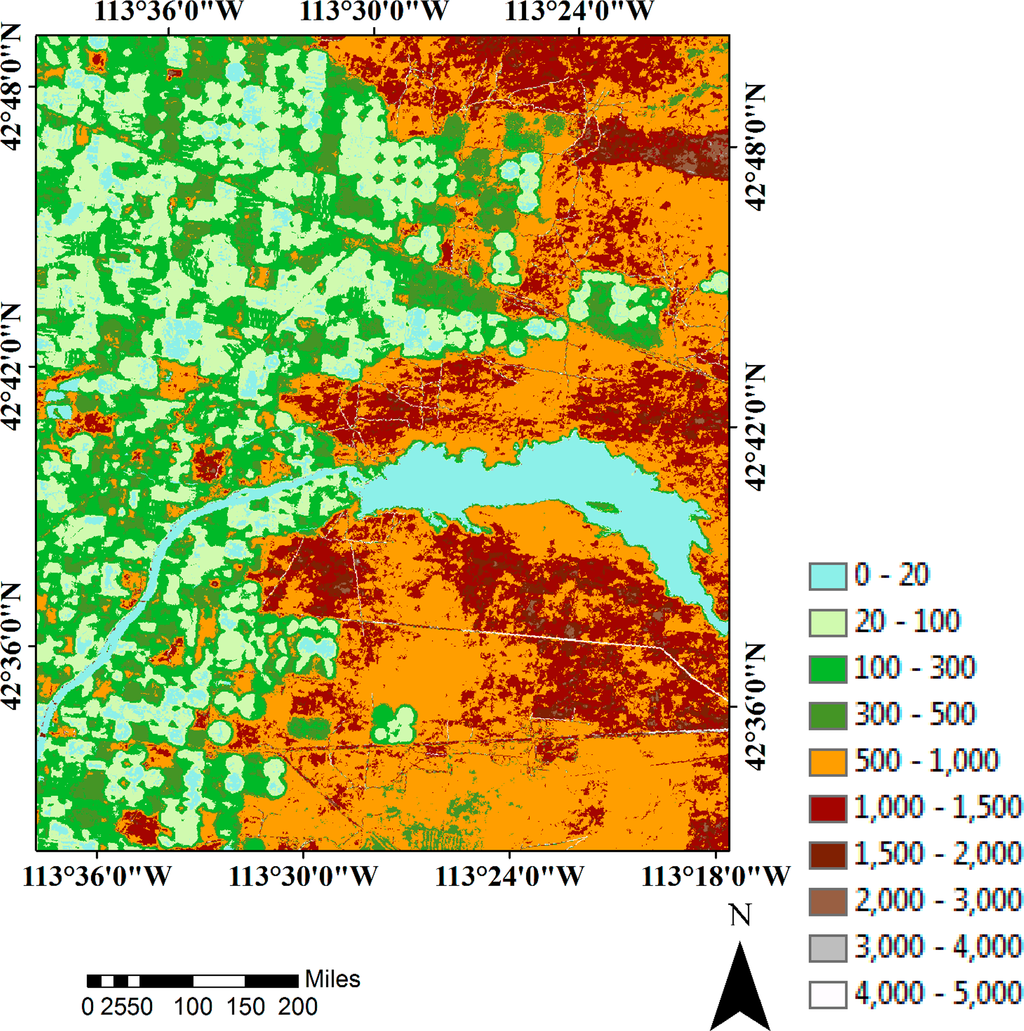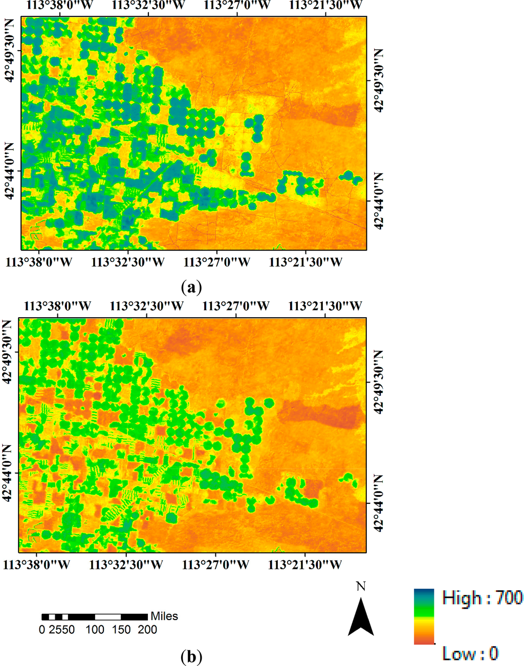 One question related to the relaxation of various environmental parameters in the PM equation is the effect of the relaxation on the value for effective bulk surface resistance (rs) required to reproduce the same λE as produced by the full PM and full aerodynamic methods. Required values for rs depend on the degree of relaxation, for example neglecting the effects of Ts on outgoing long-wave radiation or on Δ, or neglecting buoyancy correction. A large change in effective rs may point to increased risk of error in estimated λE, as differences between Ts and Ta increase. In this study, apparent, effective values for rs were computed by inverting the aerodynamic (λEaero, Equation (7)) method and PM method (λEPM, Equation (12)) and compared. Computations were made at Landsat over pass times using ETins from METRIC and simulated Ts derived through iterative calculation of the surface energy balance where λE from METRIC was an energy balance target. Satellite-based surface energy balance models, like METRIC and SEBAL, do not compute nor use rs to calculate λE, but rather calculate λE as a residual of a thermally-driven surface energy balance. Figure 3 shows the variation in effective rs for the study area on 18 June 2008, as determined by inverting the full PM method. Values for rs_PM ranged from about 20 to 300 s·m−1 for irrigated fields and from 500 to 2000 s·m−1 for rangeland areas.