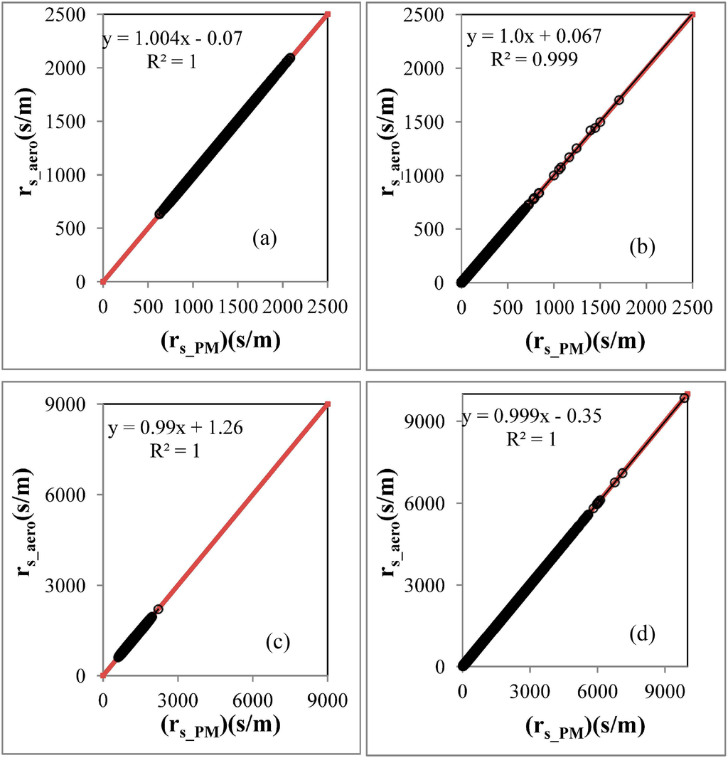 In an ideal scenario, the λE obtained from the aerodynamic method (λEaero) and the Penman–Monteith (λEPM) method should be identical. For example, if identical latent heat flux (λE), aerodynamic resistance (rah) and surface energy flux parameters are provided for Equation (1) and Equation (8), the inverted bulk surface resistance (rs) should be identical for both methods. Because of the various assumptions in the surface energy balance and surface roughness, as well as the closure problem in energy balance, it is not always possible to produce identical results from these methods. However, when utilizing surface energy balance, BAANS facilitated simulation of identical rs values through the use of the same equations for aerodynamic roughness, Rn and G. Section 4.1 shows the comparison of rs between the two models resulting in identical values from both methods.