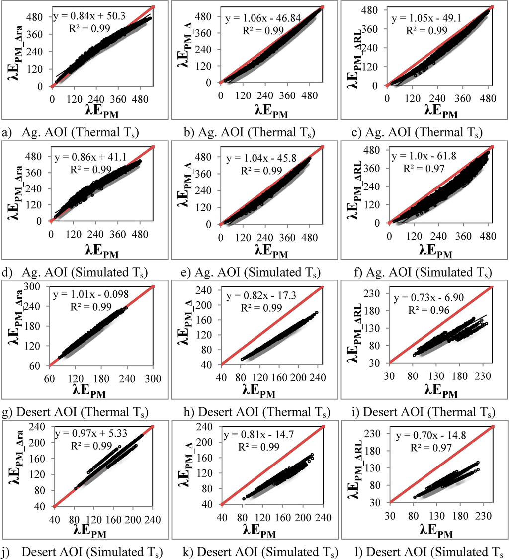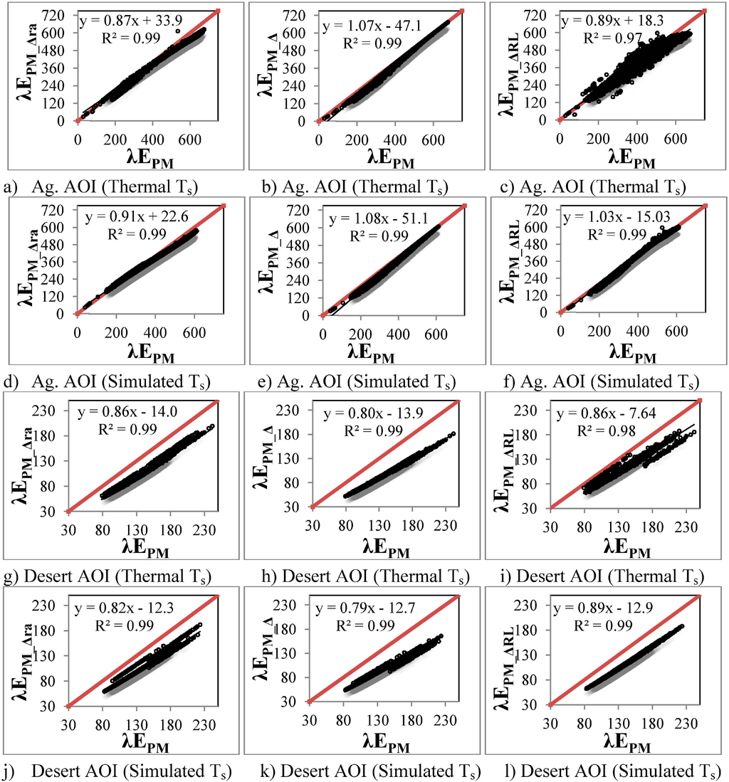 Figure 7a–c shows scatter plots for three estimates for λE based on different combinations of relaxations (simplifications) of the PM equation versus full application of the PM using Landsat-based Ts. Figure 7d–f shows the results for the same relaxations, but based on the simulated Ts produced in BAANS. Results were sampled from an agricultural AOI for 18 June 2008. Similarly, Figure 7g–i shows the results for Landsat-based Ts, and Figure 7j–l shows the results for simulated Ts for the desert AOI on the same date. NARR-based air temperature (Ta) at the 30-m blending height was about 296 K, while simulated Ts varied from 295 to 330 K for different land use classes, except water bodies (Figure 6). As discussed earlier, BAANS was able to simulate the relatively lower values for Ts in fully covered agricultural land and the higher values in sagebrush desert and grassland areas relatively well, producing values similar to Landsat-based Ts (Figure 6a,b). Figure 7 shows that application of the fully-parameterized PM method using simulated Ts produced nearly identical trends in λE as compared with those estimated based on Landsat Ts in both agricultural and desert AOIs.