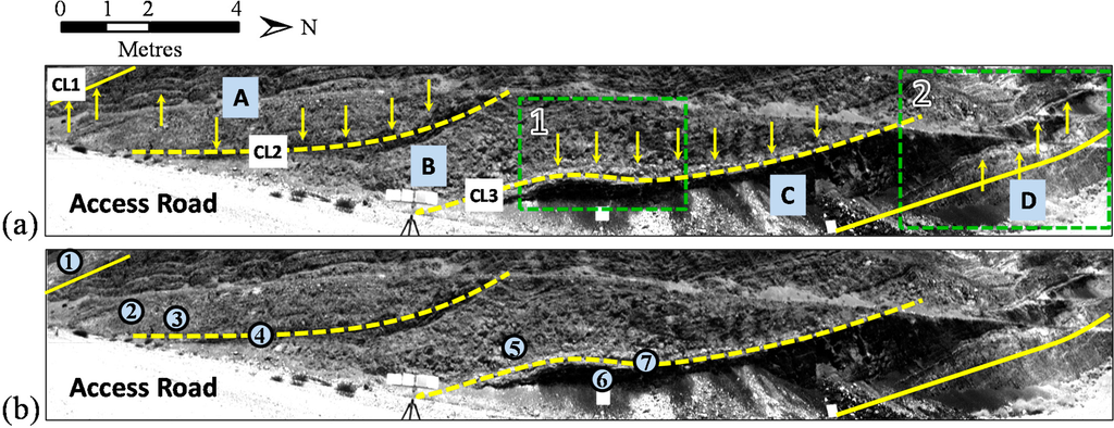 Sampling of rocks on the mine face was constrained by considerations for safety and was limited to the lower part of the mine face, within easy reach of the road. Rock samples were collected from the major geological units identified in the field (Figure 1A–D; Table 2) and from the 2 major layers of clay which separated units A and B and units B and C (Figure 1; Table 2). Between 2 and 5 representative rock samples were collected within a 50 × 50 cm plot at each of these locations. The reason for sampling the geological units between the observed layers of clay was to determine if they were compositionally different to the layers of clay which separated them.
