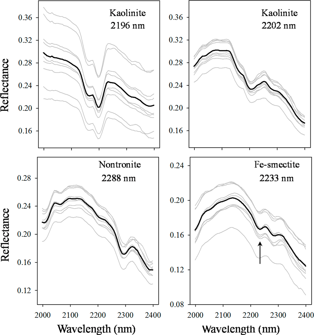 The deepest absorption features found in each pixel spectrum by AFE were located at wavelengths of 2109 nm (ligno-cellulose), 2196 nm and 2202 nm (kaolinite), 2233 nm (Fe-smectite) and 2288 nm (nontronite). The identity of the minerals causing these absorptions was determined using a combination of the XRD analyses (Table 5), the curve shape of the spectra and the wavelength locations of known mineral absorptions from the literature (Figure 10). Kaolinite was identified by its characteristic absorption doublet with a main absorption at about 2200 nm and a second absorption at about 2160 nm [20,21]. Spectra with absorption maxima at 2196 nm and 2202 nm either exhibited a discrete doublet or a shoulder at about 2160 nm. The difference in wavelength position between these two kaolinite features was small (a single spectral band); this may be due to a number of factors, including the amounts of impurities present at the location. Nontronite was distinguished by a pronounced absorption at 2288 nm caused by Fe-OH. [24]. Numerous pixels had an absorption at 2233 nm. Pixel spectra with an absorption at this wavelength also had an absorption between 2284 and 2288 nm. In reflectance spectra, the deepest of these features appears to be the one located to longer wavelengths (i.e., between 2284–2288 nm). However, after removal of the spectral continuum, the deepest feature was found to be located at 2233 nm. The wavelength locations of these absorptions is similar to those reported by [24] for Fe-smectite, specifically at 2288 nm and 2236 nm. We therefore assign the absorption at 2236 nm to Fe-smectite. In some spectra the 2284–2288 nm feature was deeper than the feature at 2233 nm in which case this suggested that the spectrum was dominated by nontronite. Spectra of pixels identified as having mineral absorption features at each of these wavelengths showed a consistent spectral shape but some had large variations in reflectance (Figure 10).