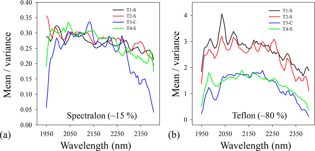 To determine the relative amounts of noise across all images, a rectangular block of 120 pixels were extracted from the center of a homogenous dark target (15% reflective Spectralon panel) and a homogenous bright target (∼80% reflective Teflon panel). For each band, the means and variances of these pixels were calculated. Amounts of noise for each band and target were calculated as the mean divided by the variance (Figure 2; Table 3). It should be noted that the derived values are only intended to be used as a measure of the relative amounts of noise between images and not an absolute measure of the signal-to-noise ratio.