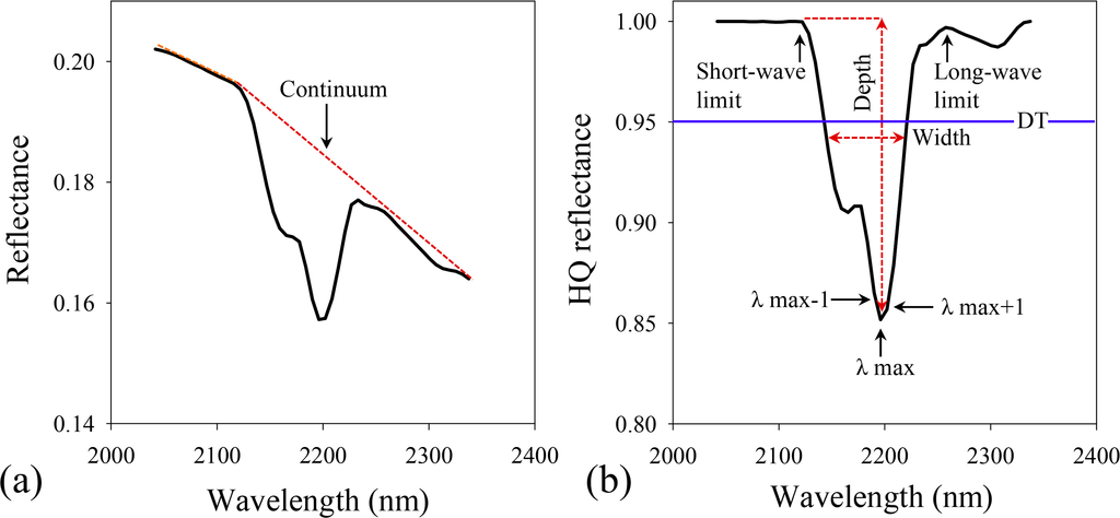 Hyperspectral imagery (SWIR; 2000–2450 nm) acquired from field-based platforms has the potential to provide the high (cm-scale) spatial resolutions required to map clays. Several analytical techniques such as the spectral angle mapper, SAM [13], the USGS tetracorder [14] or spectral unmixing, e.g., [15,16], have been used to map clay minerals by exploiting differences in their spectral curve shape caused by the presence or absence of diagnostic absorption features. Although these techniques can tell us something about the spatial distribution of clays, e.g., [17], they do not provide any information per se about their physical or chemical composition nor can they be applied to data without the use of a spectral library. Alternatively, clays can be detected or mapped by parameterising their diagnostic absorption features in the SWIR [18,19]. These features occur as a result of the hydroxyl (OH) stretch and metal-OH bend [20,21]. The parameters of absorption features include wavelength position, width and depth and these can be used directly to map clay minerals, e.g., [18,22], or as inputs to expert systems, e.g., [23]. Wavelength position, in particular, provides information related to the type of cation involved with Al, Mg, or Fe causing OH absorptions near 2210 nm, 2290 nm and 2320 nm, respectively [24]. Smaller shifts in the wavelength position of features close to 2200 nm have been related to the abundance of Al in octahedral sites in the crystal lattice of some phyllosilicates [25]. The depth of absorption features is related to abundance or the grain size of the absorbing mineral [26]. Absorption feature parameters are therefore intrinsically linked to the physical processes causing absorption and, as such, provide important information about the chemical composition of minerals. For these reasons, feature parameterization provides a powerful tool to extract information about clay mineralogy from spectra. Furthermore, this approach requires no spectral library, enabling clay minerals to be mapped without a priori knowledge of any particular surface.