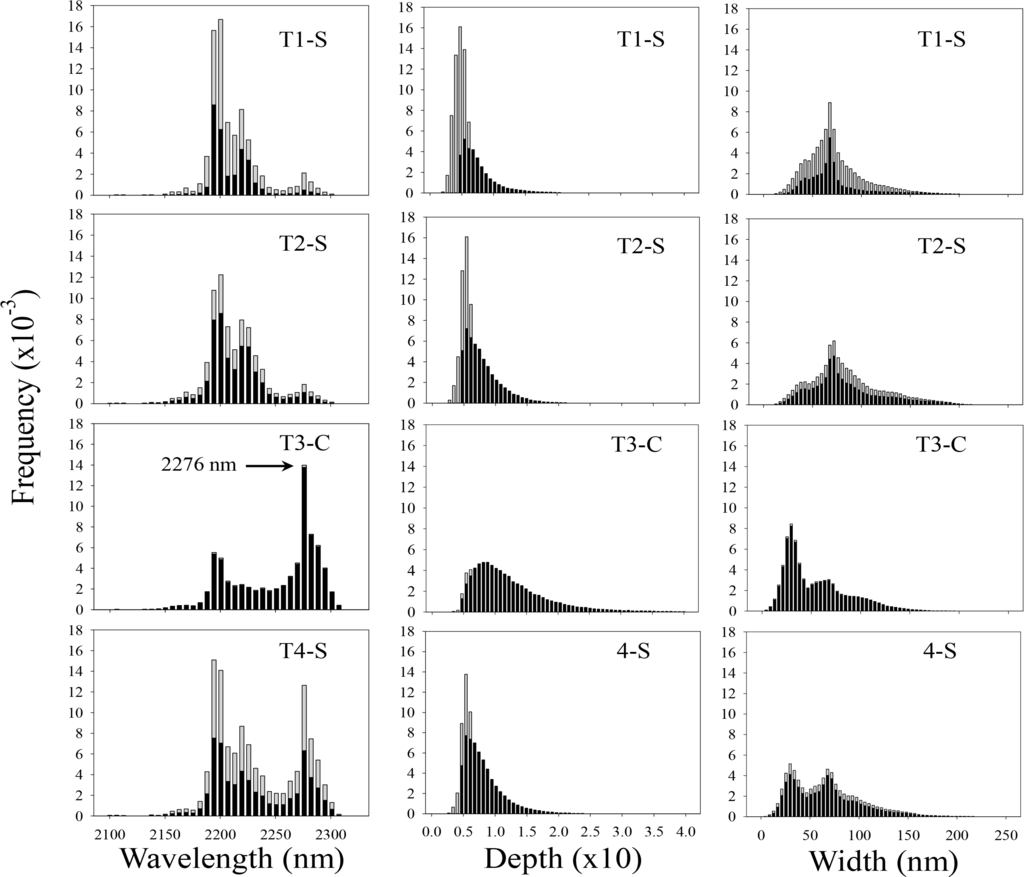 The frequency distribution of pixel values for each feature attribute and each image showed that there were large amounts of variability in parameters among images (Figure 4). The distribution of pixel values representing wavelength position for T1-S and T2-S were very similar; this was expected because these images were acquired under similar conditions of illumination. T1-S, T2-S and T4-S had large numbers of pixels which were excluded by the depth threshold (as indicated by the relatively large differences in number of pixels represented by the grey and black bars). Images T3-C and T4-S had a much larger number of pixels with an absorption feature at wavelengths greater than 2250 nm, however, the distribution of pixels with an absorption feature at wavelengths of less than 2250 nm in T4-S were similar to those found for T1-S and T2-S. Image T3-C was different to all other images because nearly all pixels in the image were included by the depth threshold, i.e., they were considered by AFE to have absorption features, as indicated by the dominance of black bars in the graph.