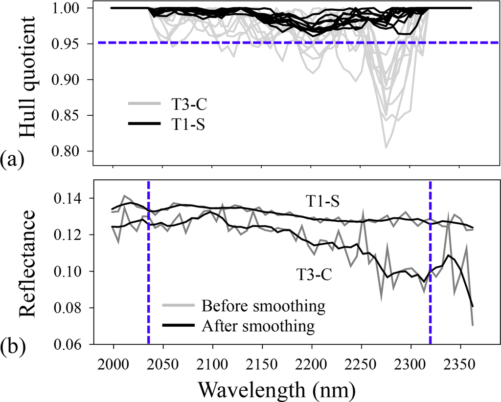 The peak in the numbers of pixels with an absorption feature at wavelengths greater than 2250 nm in image T3-C was investigated further. It was not known whether this peak was caused by noise or as a result of subtle mineral absorption features becoming more pronounced under the more diffuse illumination conditions under which T3-C was acquired. The modal peak in this wavelength region was at 2276 nm (indicated in Figure 4). Pixels with absorption features at 2276 nm were identified in the wavelength parameter image derived from T3-C. A random selection of these pixels was extracted from images T1-S and T3-C; in each case the same image pixels were used (n = 10). The extracted spectra comprised hull quotients spectra and reflectance spectra from images before and after spectral smoothing (Figure 5). This was done to determine if the smoothing process had introduced spectral artefacts. Hull-quotients spectra from T1-S had a relatively flat spectral profile but the same pixel spectra from T3-C showed distinct dips in reflectance at wavelengths greater than 2250 nm (Figure 5a). No spectra from T1-S had absorption features which had values less than 0.95 (the depth threshold value used to identify absorption features). Spectra from T3-C did, however, have “features” which extended below the depth threshold, particularly around 2276 nm. Reflectance spectra from corresponding pixels from the unsmoothed and smoothed imagery showed no coherent absorption features in image T1-S (Figure 5b). In image T3-C, however, the same pixels showed a broad dip in reflectance at wavelengths greater than 2250 nm (Figure 5b). This indicated that for image T3-C absorptions at about 2276 nm, and other wavelengths longer than 2250 nm, were caused by factors which are unrelated to the mineralogy of the mine face.
