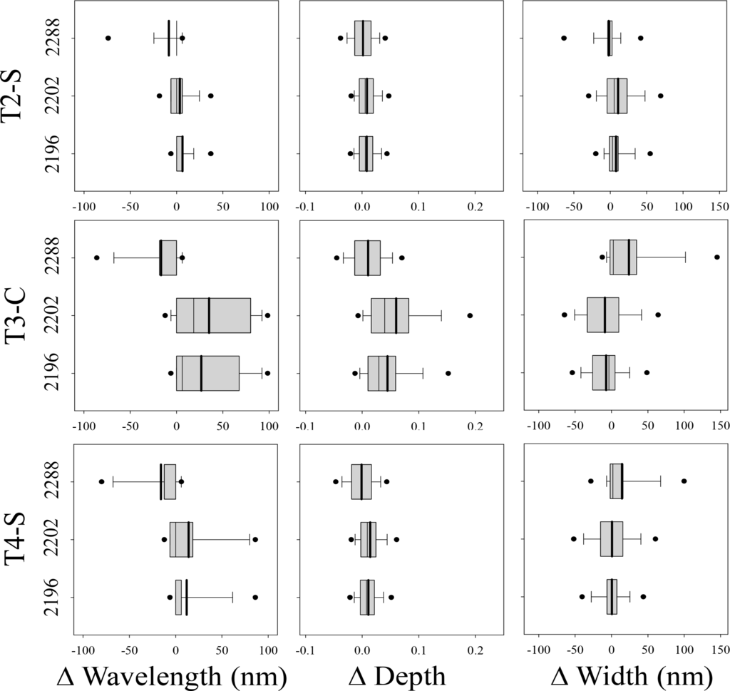 Absorption feature parameters in images T2-S, T3-C and T4-S changed in relation to those in image T1-S (Figure 6; Table 4). Wavelength positions of absorption features associated with kaolinite (centered on 2196 nm and 2202 nm) and nontronite (centered on 2288 nm) were, respectively, greater and smaller than the absorption features found in the same pixels in the baseline image (T1-S; Figure 6, Table 4). In all cases, this effect was more pronounced in the image acquired under cloud (T3-C). Changes in wavelength position were also more variable in T3-C than for images acquired in direct sunlight (T2-S and T4-S). The depth of all absorption features generally increased in all images relative to T1-S, with the greatest increase found for image T3-C. In comparison, changes in depth for images T2-S and T4-S were relatively small. Of the three measured parameters, changes in absorption feature width showed the greatest inconsistencies among different absorption features and images. For the features associated with kaolinite, width increased in T2-S and T4-S but decreased in T3-C. The feature associated with nontronite, showed a small decrease in width in T2-S but a relatively large increase in T3-C and T4-S. In general the largest changes in all feature parameters were found for the image acquired under cloud (T3-C) and the smallest for the image acquired under direct sunlight (T2-S, i.e., under similar illumination conditions to the baseline image T1-S.