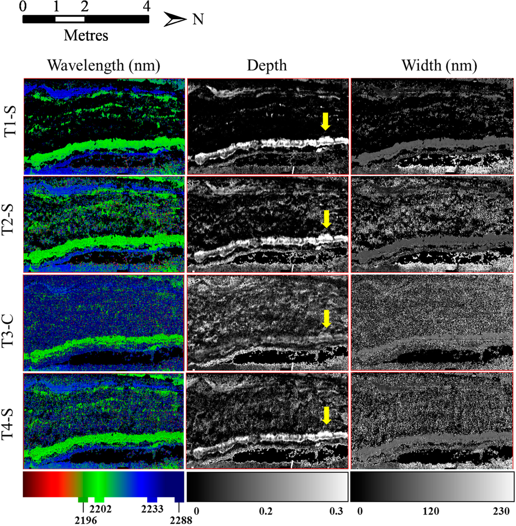 Pixels describing absorption feature depth in T1-S, T2-S and T4-S showed similar spatial patterns with respect to their intensity (brightness), with values in each image increasing in proportion with those in other images. For example, an area of intense absorption (indicated by arrows in Figure 7) of similar shape and extent is present in T1-S, T2-S and T4-S. Pixel values in this area are also greater (brighter) than other pixels in the same image. Image T3-C showed a different spatial pattern to all other images. For example, in the area of intense absorption (indicated by arrows in Figure 7) pixel values were not greater than for other areas in the same image; neither did they form an area of similar shape or extent as was observed in other images.