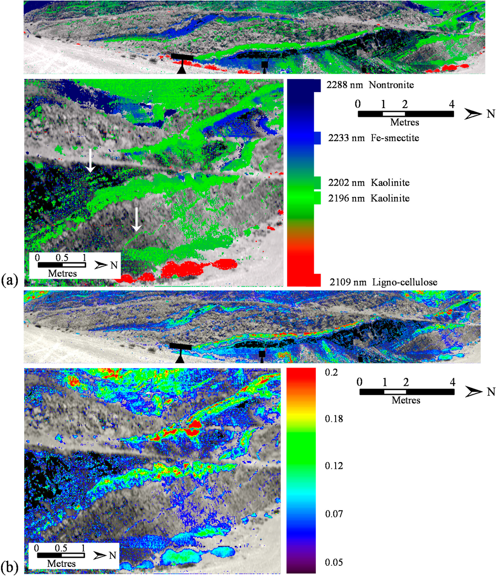 Images of wavelength position showed the presence of many layers of different types of clay of variable widths and lengths (Figure 8a). The depth of absorption features, as described by the depth parameter image were very variable spatially (Figure 8b). The deepest absorption features were related to kaolinite nontronite and Fe-smectite absorption features (cf. ( http://en.wikipedia.org/wiki/Cf.), Figure 8a,b). The clay layers in the image that were found by AFE were spatially coincident with the position of major clay layers recorded from the field survey (arrows in Figure 1) and with the predictions made from quantitative XRD of rock samples (see Section 3.2.2 and plot locations in Figure 1b). Several thin (2–4 cm thick) layers of clay which were not observed in the field were identified on the mine face by AFE (arrows in Figure 8a).