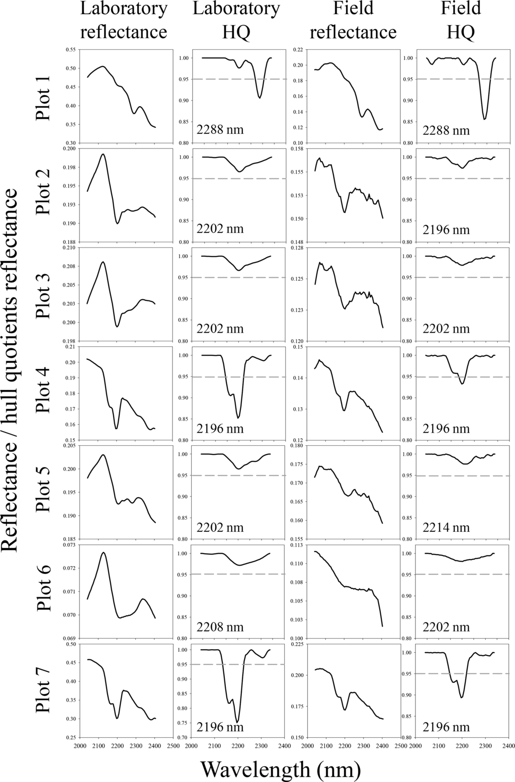 XRD analyses of samples taken from plots on the mine face revealed several minerals (Table 5) which have absorption features in the SWIR, as determined from the USGS and JPL spectral libraries: clinochlore (2325–2345 nm), nontronite (2284–2295 nm), kaolinite (2200–2205 nm) and vermiculite (2300–2325 nm). It was predicted that absorption features diagnostic of these minerals would be found in spectra in rocks from Plot 1 (nontronite), Plot 4 (kaolinite), Plot 6 (clinochlore, vermiculite) and Plot 7 (kaolinite). Amounts of kaolinite present in Plots 1, 3 and 6 were considered to be too small to cause absorption features of sufficient depth to be observed in image spectra or included in the depth threshold.