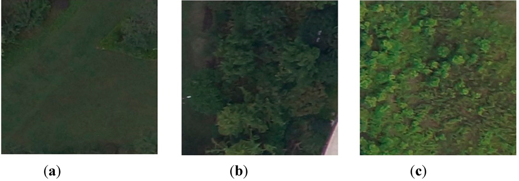 According to field survey and the aim of the project, three vegetated land covers were chosen as follows: grass, trees and shrubs. The details of these land covers acquired by UAV are shown in Figure 4. All these vegetation show similar colors but different shapes and textures. The inclusion of texture measures may help improve between-class separability hence to increase classification precision.