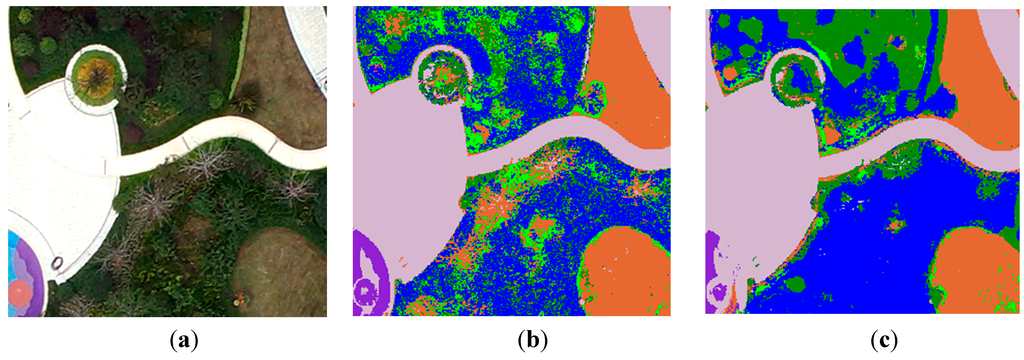 To further justify the performance of the performance of the proposed methodology, an area about 2 km2 of Lishui City was tested. The image size was 28,571 × 14,286 and the processing time was about 91.24 min. The processing burden will rise with the increase of image size, and downsampling may be used to reduce the computation in practical applications. The classification result was not shown in this paper because the main focus is on the method itself and the comparison with other methods such as Maximum Likelihood and OBIA.
