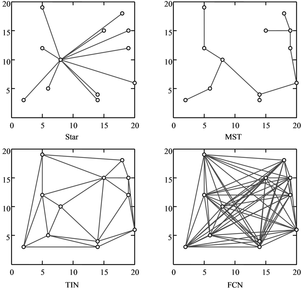 Several typical PS networks used elsewhere, including star network, minimum spanning tree (MST) network, triangular irregular network (TIN), and freely connected network (FCN).