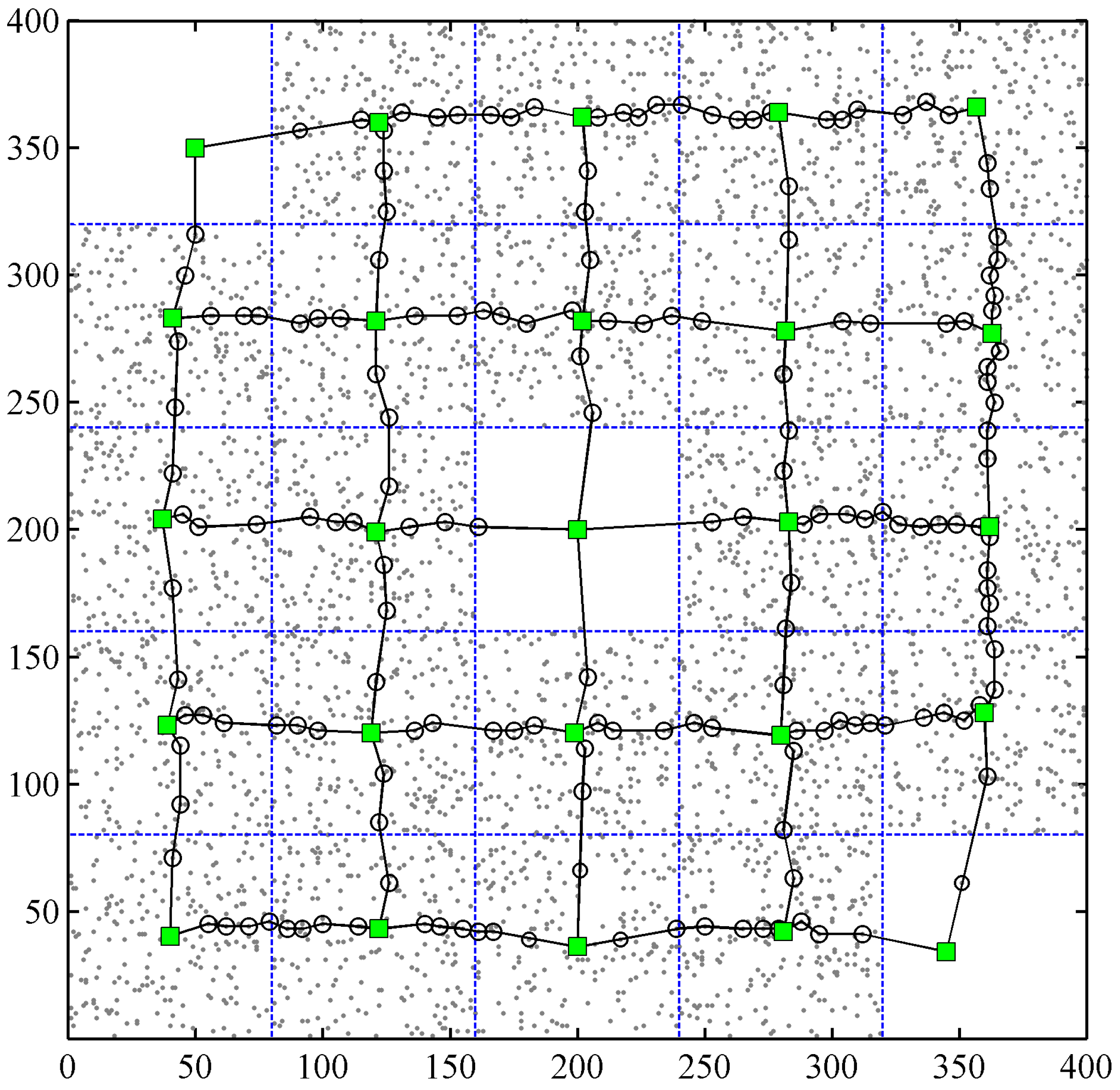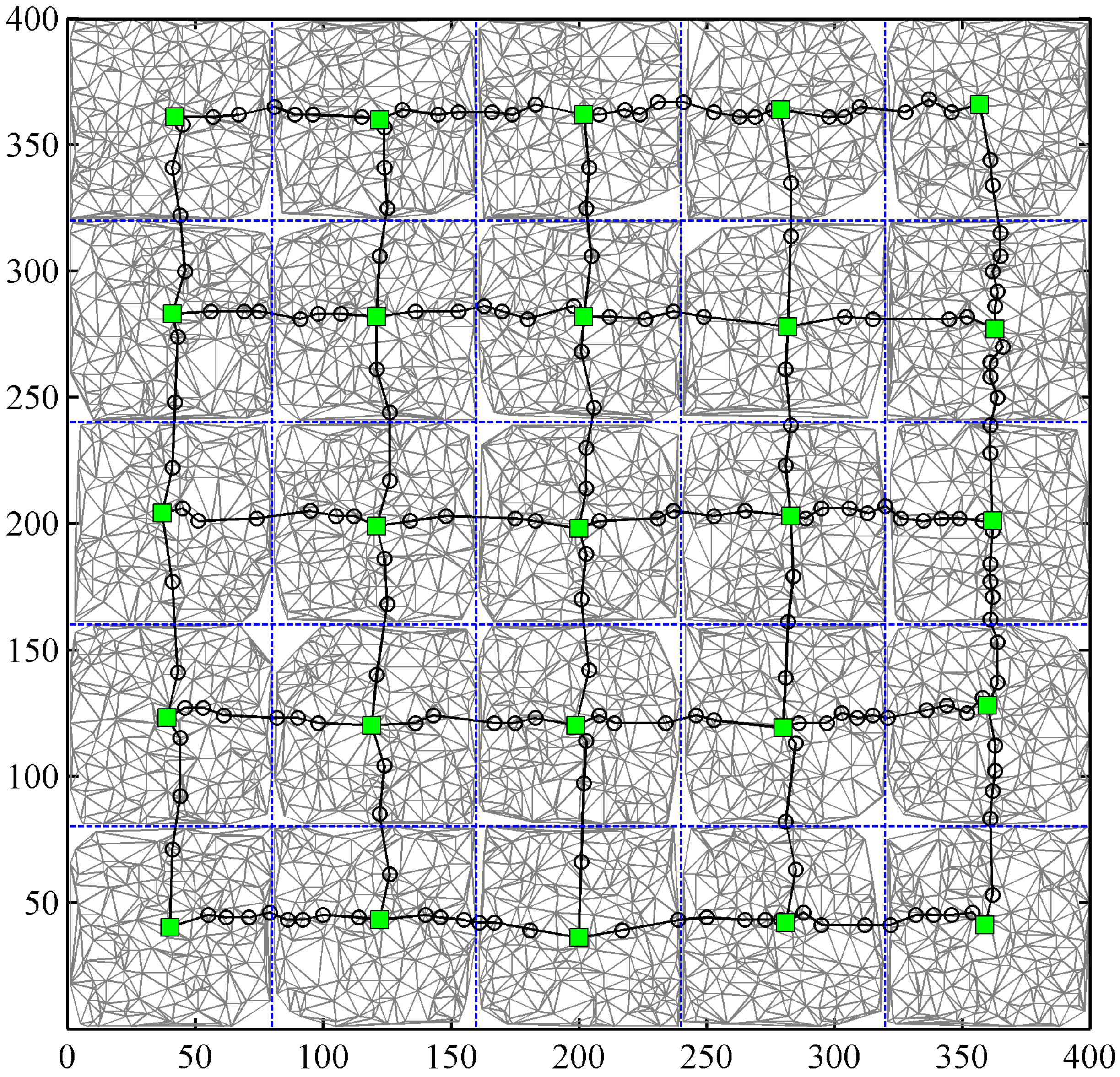 An example of the global control network (GCN) and the localized triangular irregular networks (LTINs) constructed with the 5000 PSs (marked by dark dots) simulated for an area with a size of 400×400 pixels. A primary control point (PCP, marked by a filled green square) is selected for each grid, and the PCPs in adjacent grids are linked by the transition PCPs (marked by black circles), thus forming the GCN (marked by black lines). All the PSs in each grid are connected to form the LTIN (marked by gray lines).