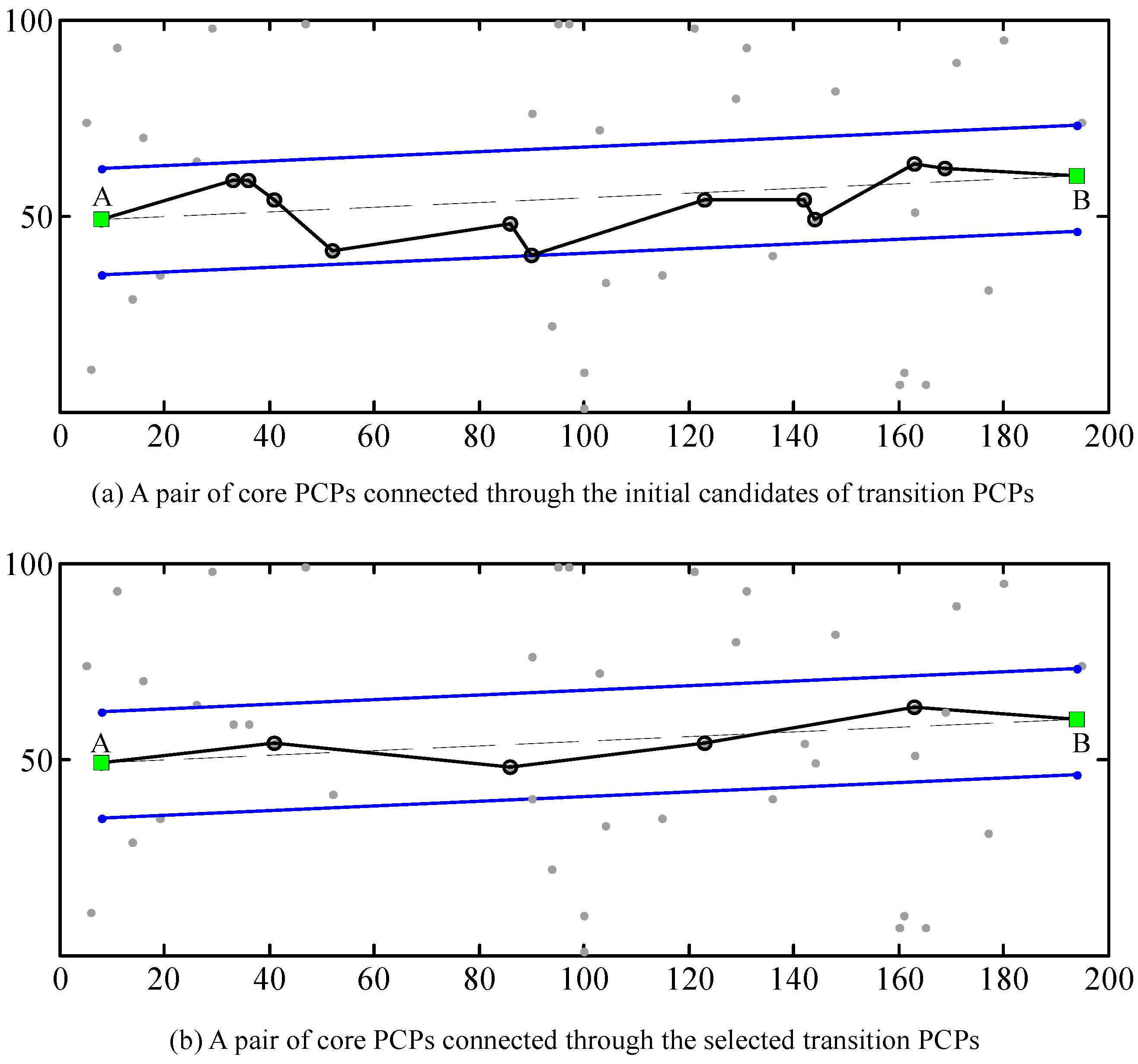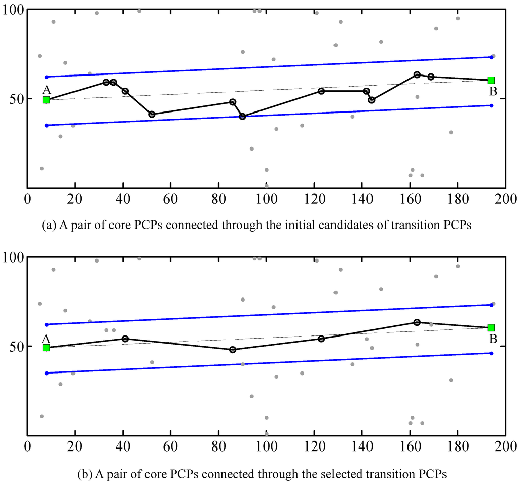 The transition PCPs should be determined using some definite criteria. Here we propose a two-step method for choosing the transition PCPs. As an example, Figure 3 shows how the transition PCPs between the two core PCPs (i.e., A and B) are identified properly. The first step is to set a boundary (i.e., blue lines in Figure 3) around the line AB (a band of 30 pixels used for this example), and the PSs within the boundary and located nearest to the line AB in each normal direction are chosen as the initial candidates of transition PCPs. The second step is to further discard some candidates through removing some very short arcs by using a distance threshold (30 pixels used for this example), thus obtaining the final transition PCPs. The points and connections derived by the two steps can be exemplified by Figure 3a and b, respectively. It can be seen from this example that four PSs are eventually selected as the transition PCPs from 11 PSs (i.e., the initial candidates for transition PCPs) through the two-step selection process.