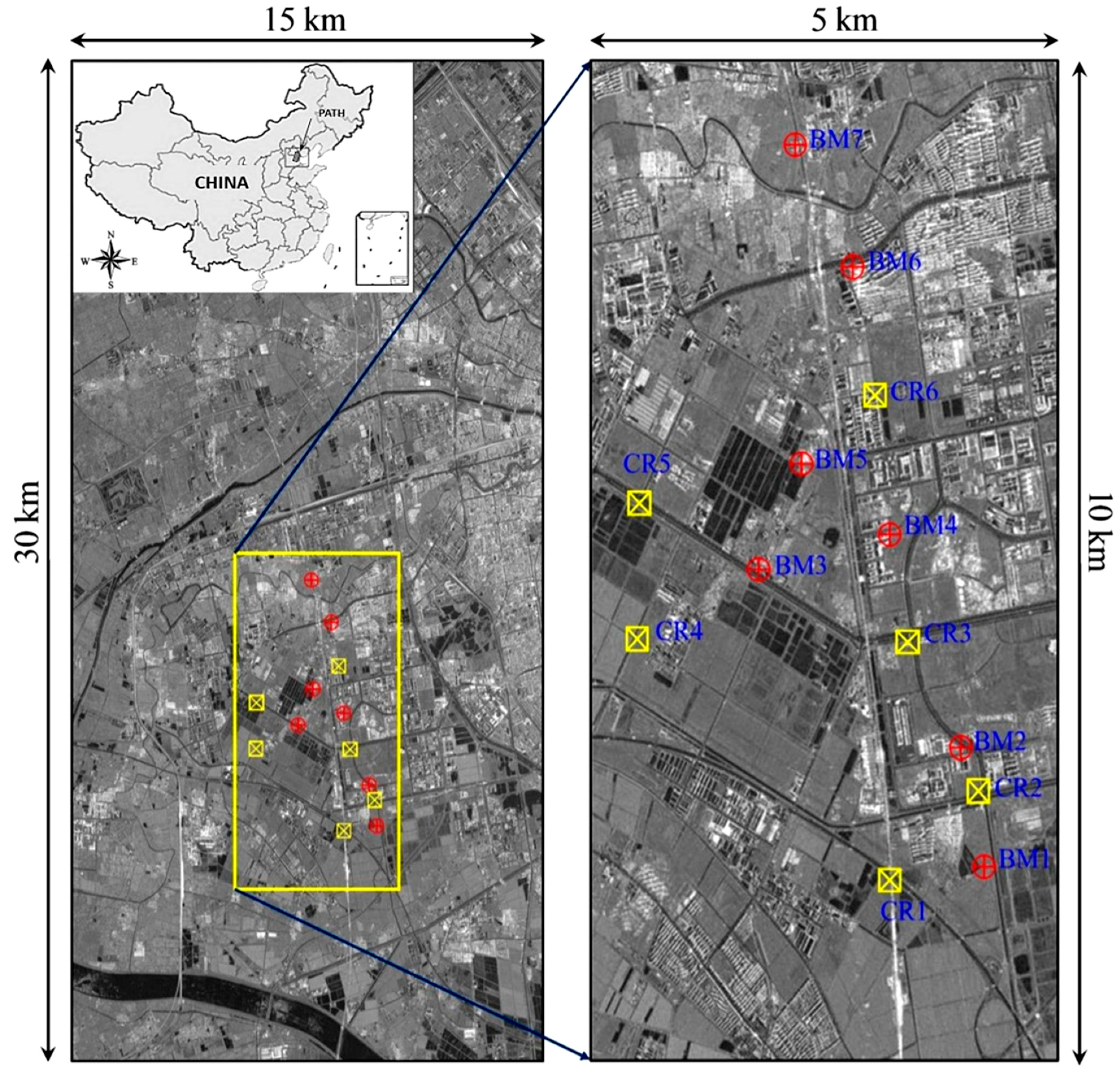 The location map and the study area around Tianjin in China. The insert at the top-left corner shows the location map and the coverage of the TSX scenes. The left panel shows the amplitude image (averaged from 40 TSX images) in which the study area is marked by the rectangle. The right panel shows the enlarged amplitude image of the study area in which the seven benchmarks (BMs) and six corner reflectors (CRs) are annotated for later analysis.