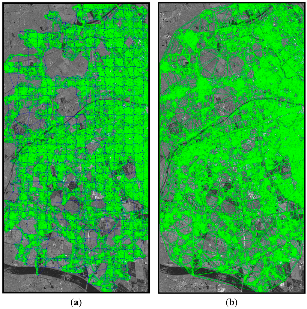 The two types of PS networking for the study area: The left panel (a) shows the global control network (GCN) plus localized triangular irregular networks (LTINs) in the 15 × 30 grids of the study area, including 2832 arcs in the GCN and 2998810 arcs in the LTINs. The right panel (b) shows the global triangular irregular network (TIN) of the study area, including 3011804 arcs.