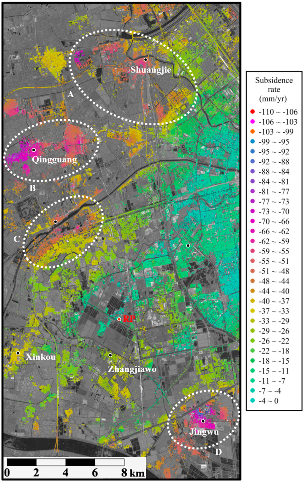 The subsidence rates at all the PSs derived by the proposed hierarchical approach. Four remarkable subsidence troughs appeared in the suburban areas, as marked by ovals (i.e., A, B, C, and D), corresponding to Shuangjie, Qingguang, Shanghetou, and Jingwu towns, respectively.