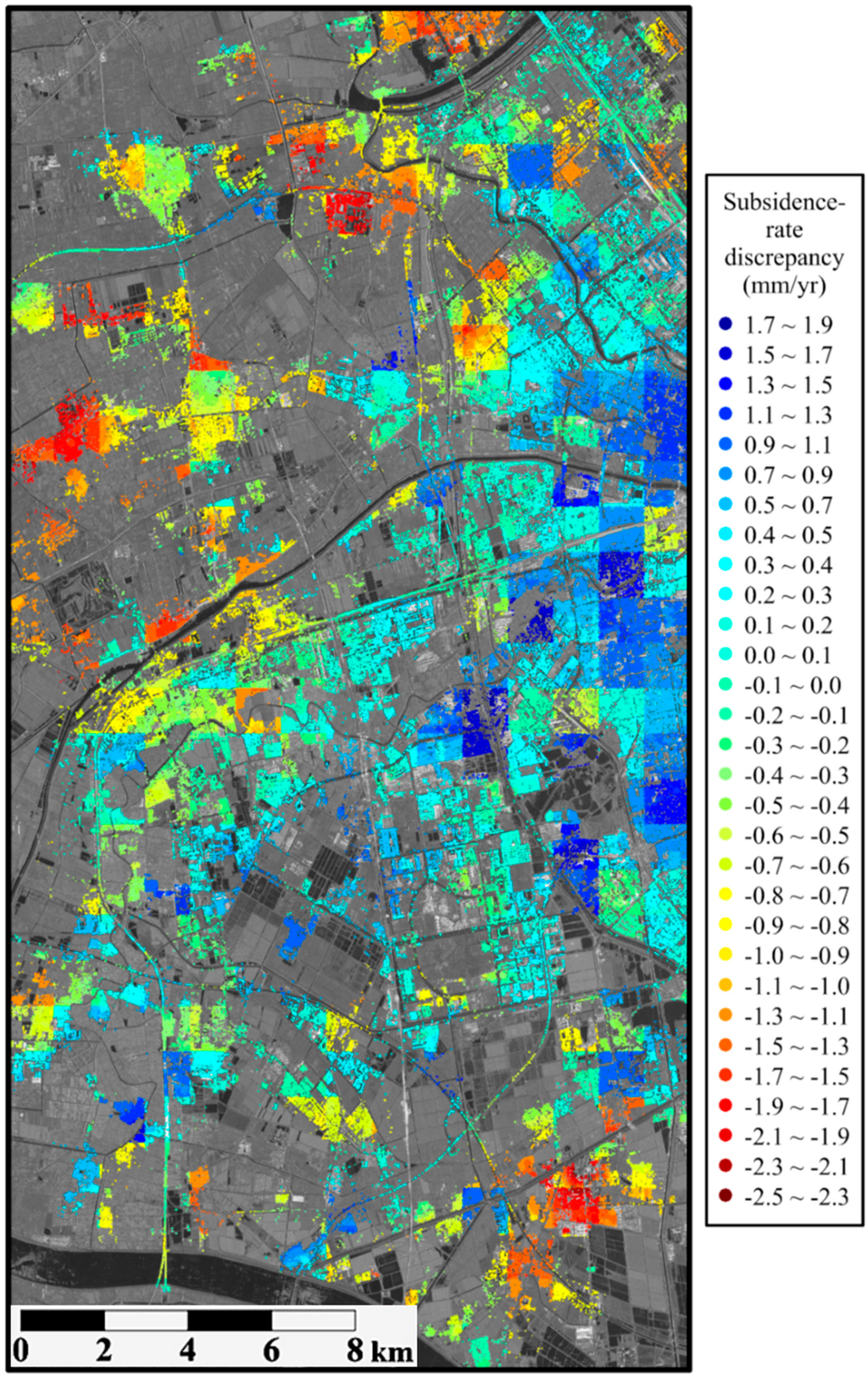 By statistical calculation, we analyzed the differences of subsidence rates between the two types of solutions (i.e., based on the GCN-LTINs and the global TIN). Figure 8 shows the discrepancies at all the PSs. It can be concluded that the two types of solution are globally in close agreement with each other. However, a closer inspection of Figure 8 indicates that some minor jumps in the discrepancies appear in the image space.