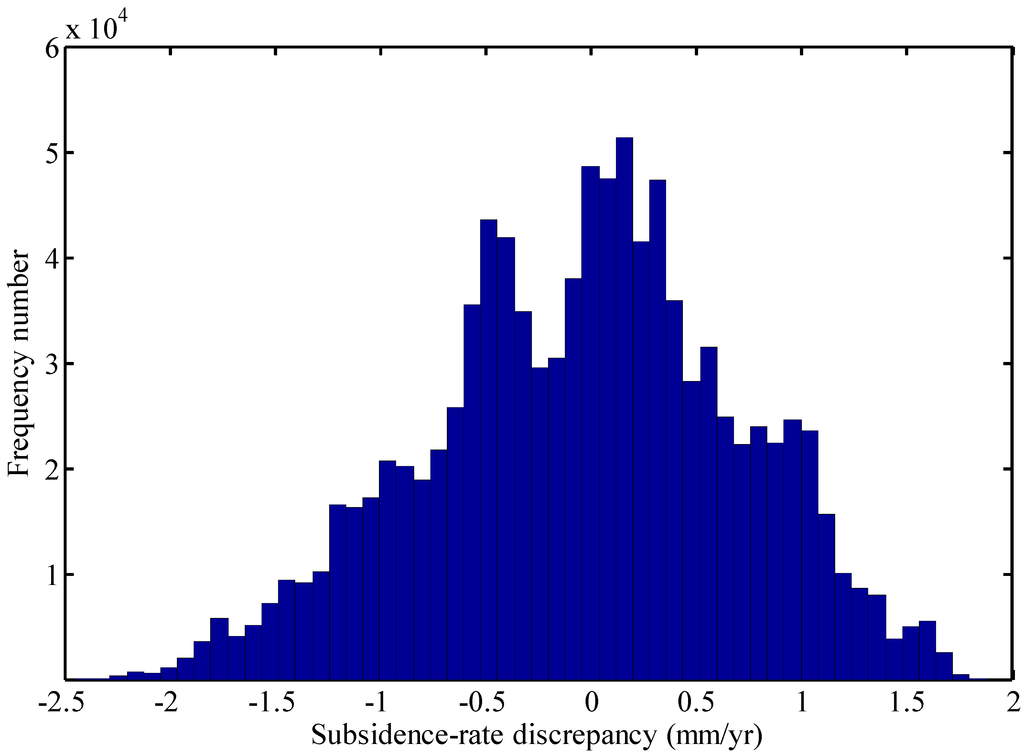 The histogram of discrepancies of subsidence rates at all the PSs between two types of solutions based on the global control network plus localized triangular irregular networks and the global triangular irregular network, respectively.