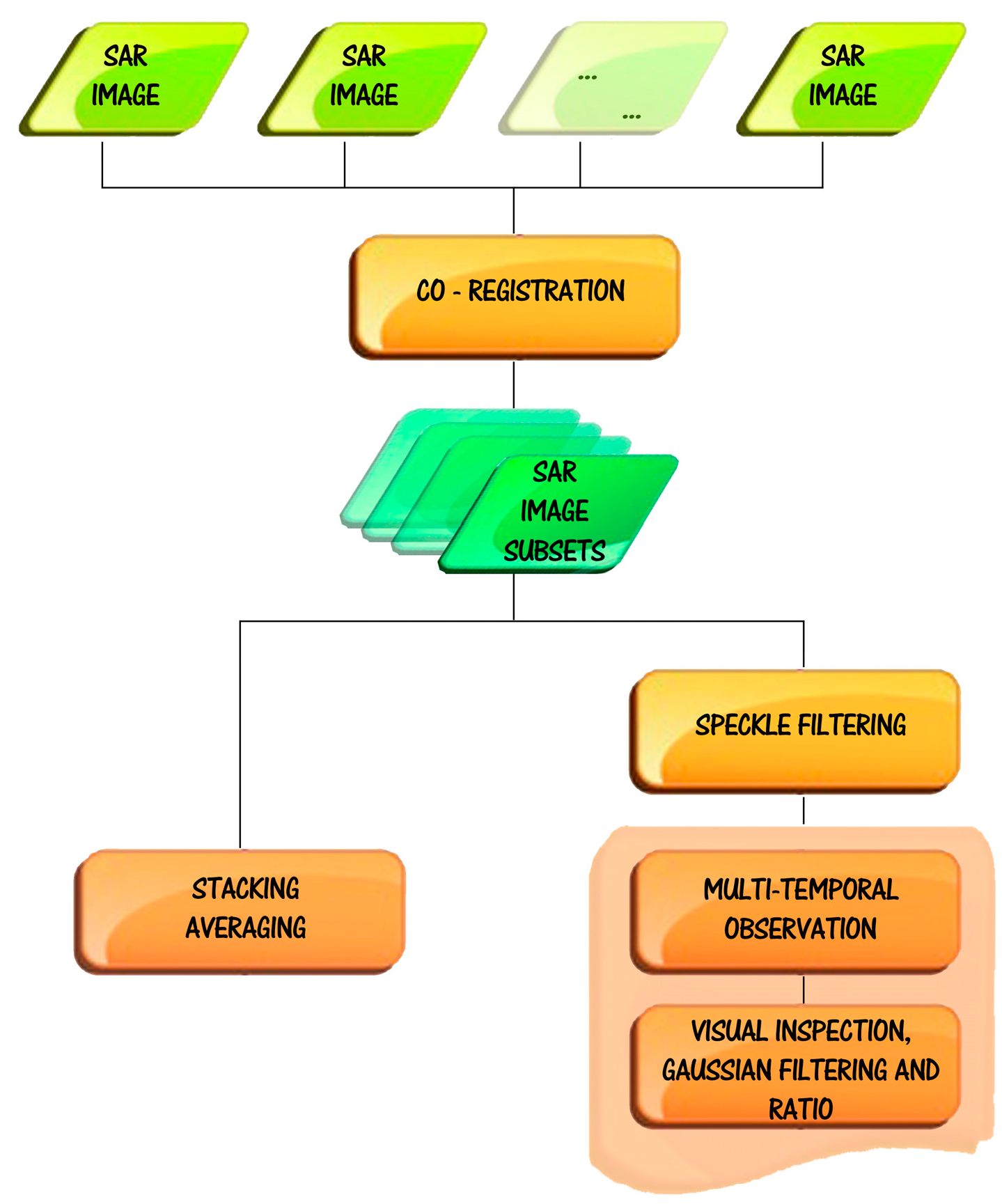 Multi-temporal studies are mainly based on co-registration, speckle filtering, stacking averaging, multi-temporal surveillance consisting of steps of SAR image visual inspection, Gaussian filtering, and ratio change detection (see Figure 1).