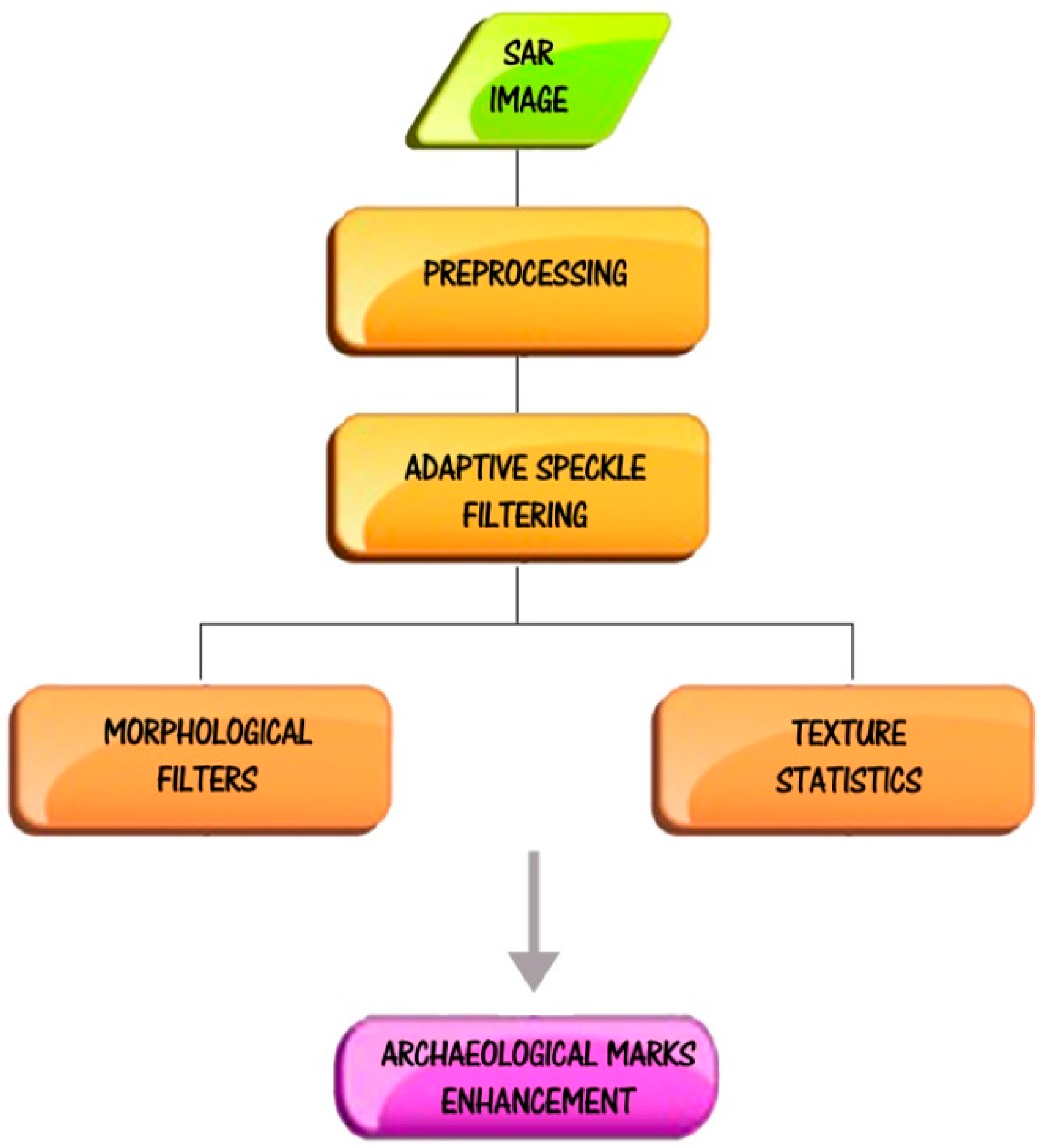 More sophisticated approaches, such as those based on the wavelet filter, are not considered because they require numerous parameters to be set, which means that they cannot be promptly and easily applied to different geographical areas and archaeological features. In order to achieve a satisfactory compromise between the two opposite needs of smoothing noise and protecting detailed information, we adopted an approach based on both speckle reduction applying enhanced Lee, using a small window size (3 × 3 up to 5 × 5 pixels) and feature enhancement filtering (see Figure 2). It is important to note that the presence of speckle in SAR data makes the traditional edge detectors developed for optical images inefficient and feature identification and extraction extremely difficult. To cite an example, the processing of tonal information is not sufficient to reveal all the information stored in the SAR data. Several authors proposed robust detection operators to identify step edges in speckled images, but this methodology may be inadequate for archaeological features with very subtle returns [33,34]. To cope with this issue, after noise removal using enhanced Lee, we also include a textural and morphological filter [35]. The former filter typology is more suited to extracting the complementary information available from the statistical indicators (such as mean, standard deviation coefficient of variation, autocorrelation for lags, etc.). Conversely, the latter filter typology, based on mathematical morphology, is more suited to finding surface discontinuities, changes in material properties and variations in moisture content, etc. Morphological filters [35,36] are nonlinear image transformations based on morphological operations, such as opening, closing or dilation and erosion, which are size and shape sensitive and are found to be effective at making the image sharper.