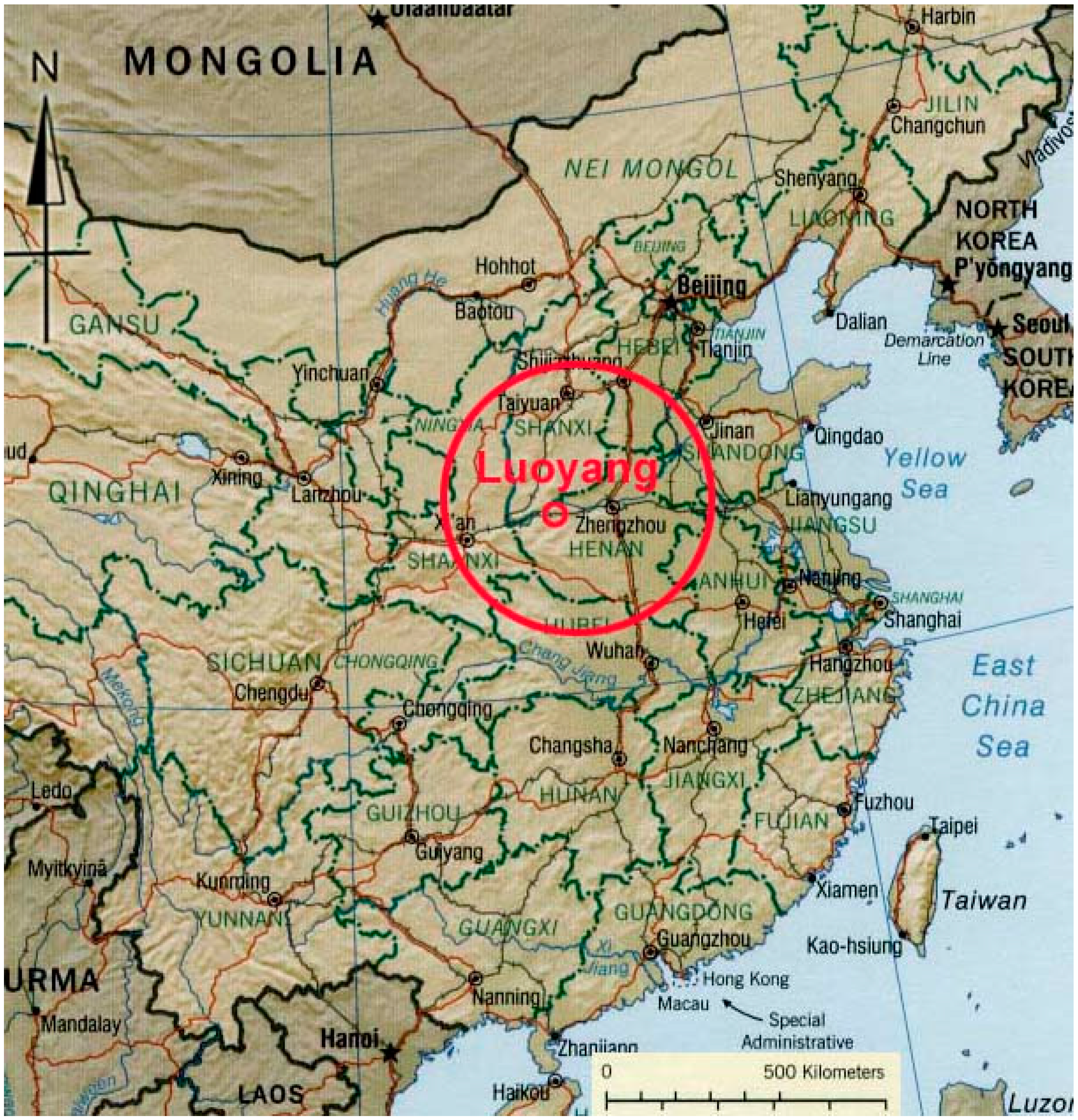As one of the ancient imperial capitals in Central China, running along the Silk Road’s Chang’an-Tianshan Corridor (nominated a World Heritage site in June 2014), the Eastern-Han to Northern-Wei Dynasty Luoyang city dates back to 100–500 AD and is located to the northeast of the modern Luoyang city in the Henan Province of China (Figure 3 and Figure 4).