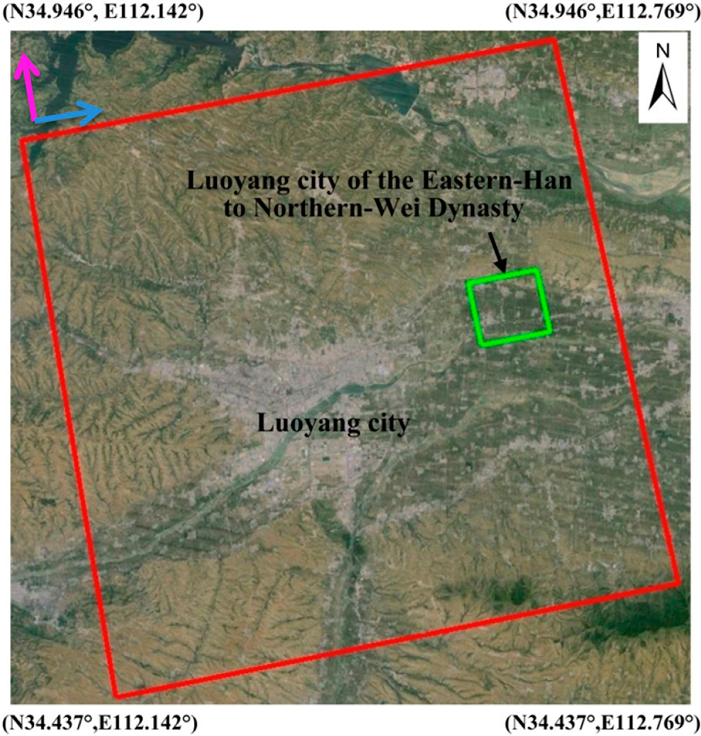 The swath of Stripmap HIMAGE (highlighted by the red polygon) and the Eastern-Han to Northern-Wei Dynasty city of Luoyang (highlighted by the green polygon) covered by the COSMO-SkyMed in this study (courtesy of Google Earth). The green polygon indicates the Northern-Wei Dynasty Luoyang capital city in Figure 5; purple and blue arrows indicate the flight path and direction of SAR illumination.